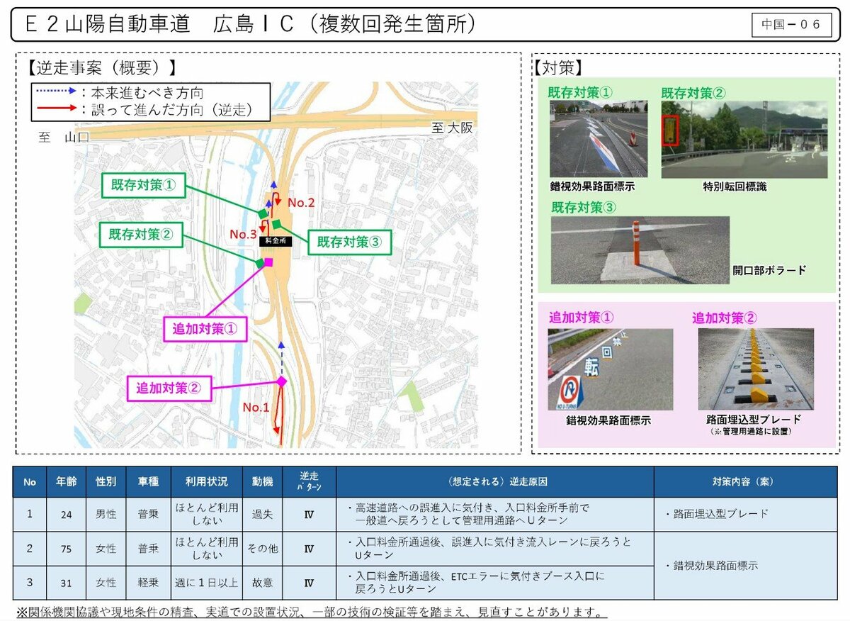 このうち、広島ICでは、過去に高速道路の入口に誤って進入し、引き返そうとして、男性(24)が管理用通路を逆走したケースがあったため、通路に路面埋込型ブレードが設置される予定です。他にも、料金所の手前に錯視効果のある路面標示を設置し、逆走を防ぎます。