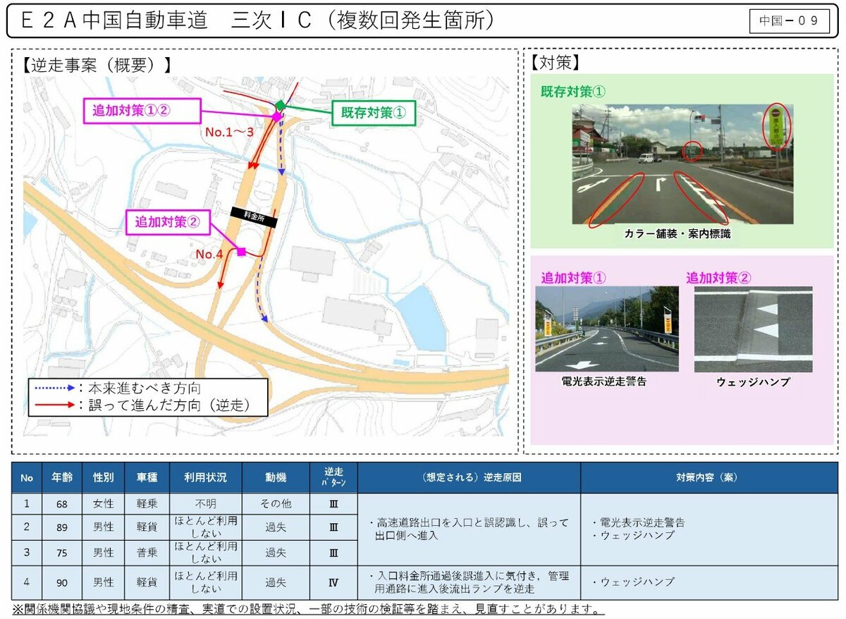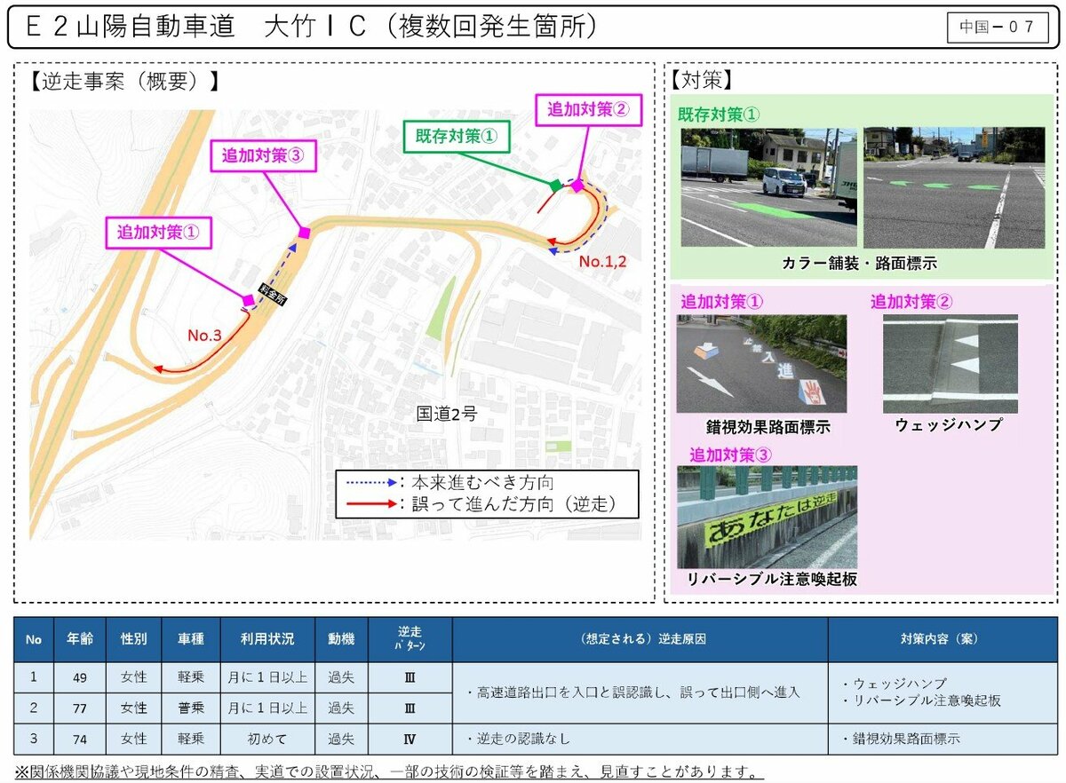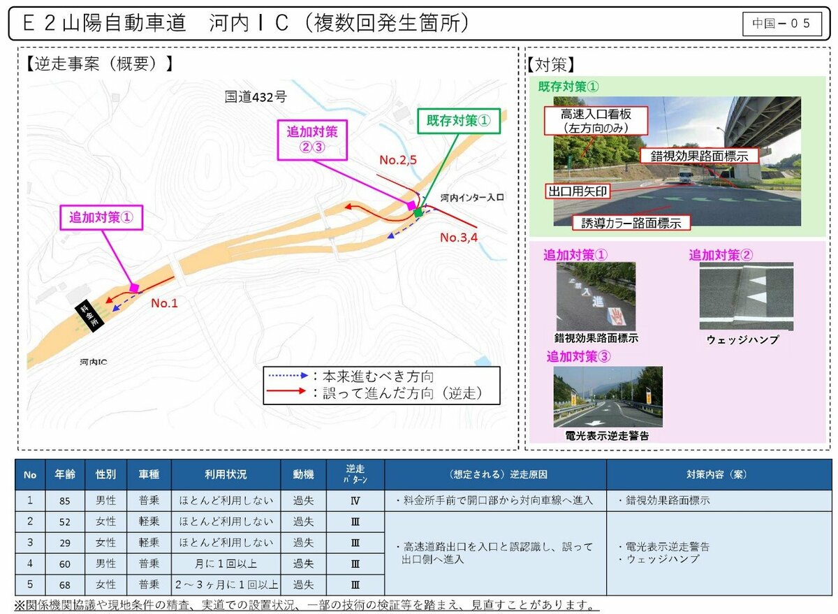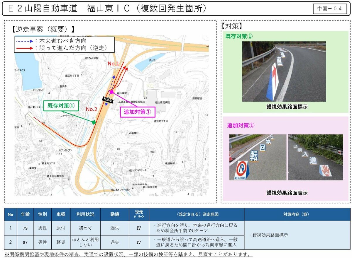 広島県内では他に、山陽道の福山東IC、河内IC、大竹ICと中国道の三次ICの4箇所でも、ブレードは設置されないものの、逆走を警告する電光掲示板の設置や、錯視効果のある路面標示などの対策が行われます。