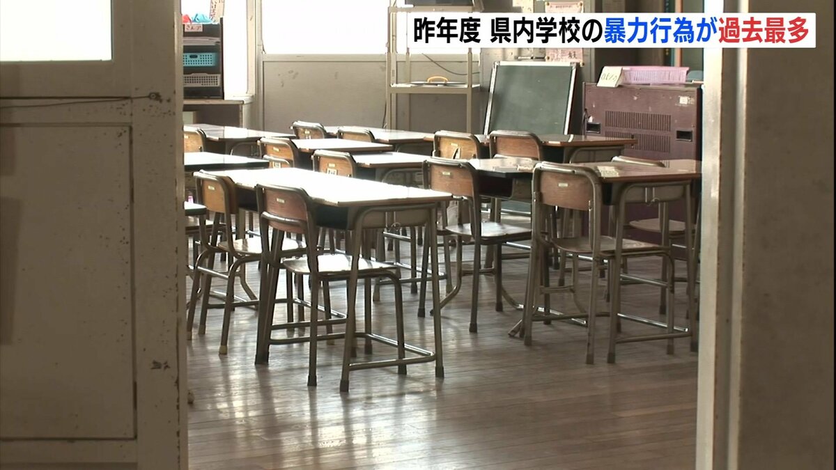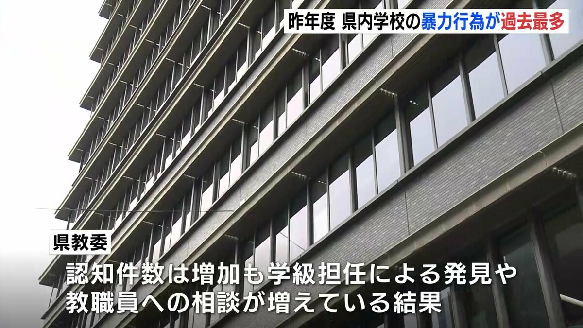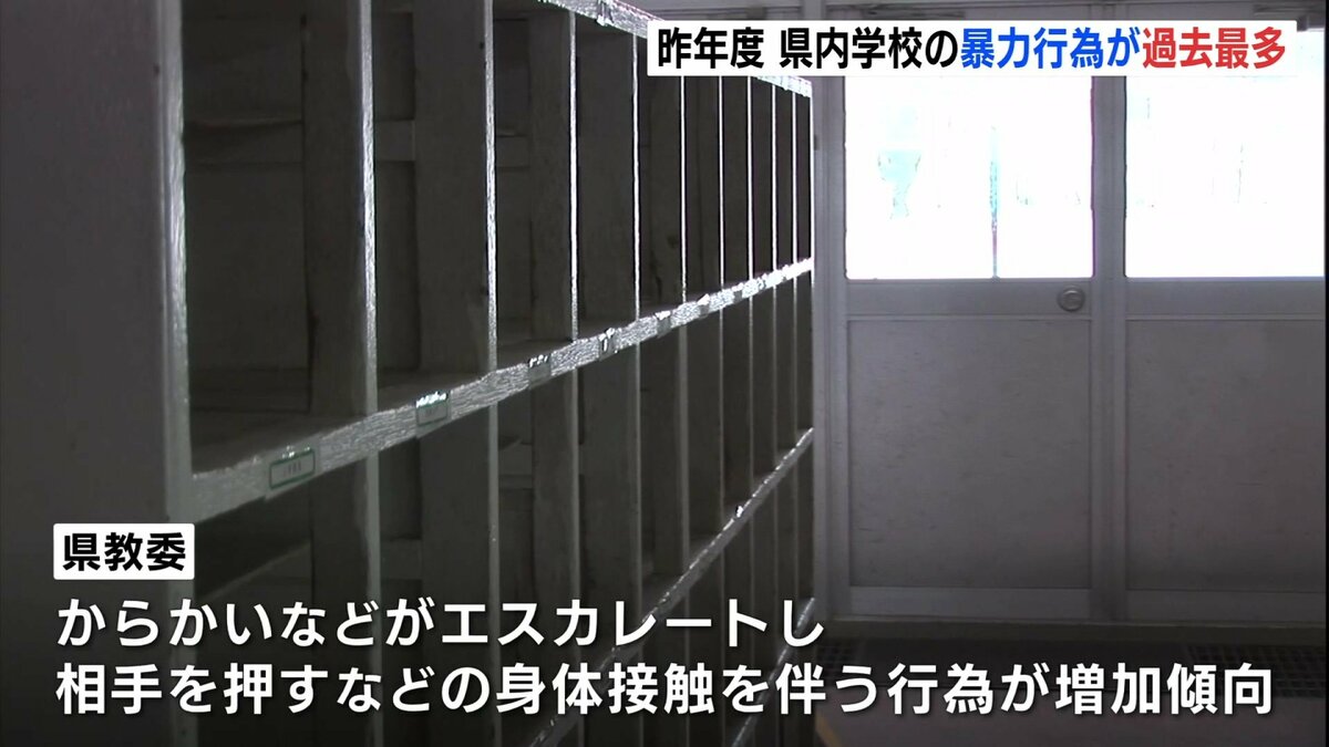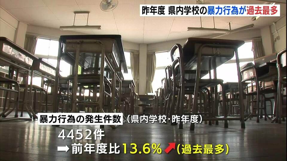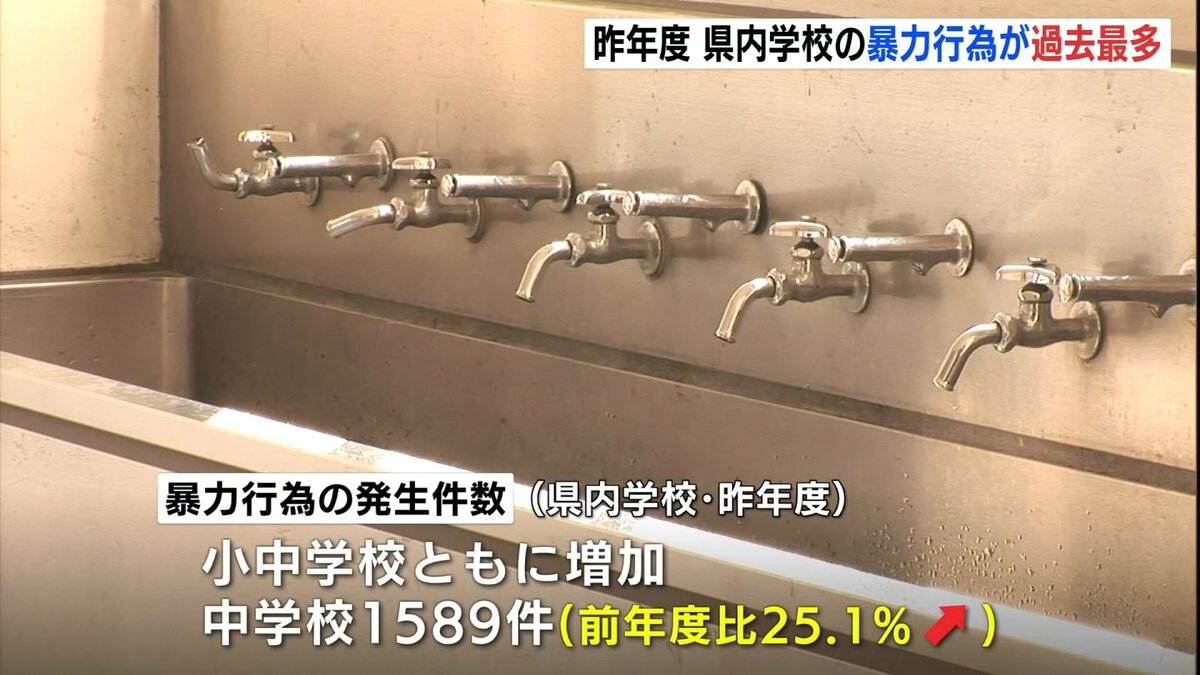 これは、文部科学省が実施した調査で明らかになりました。それによりますと、2024年度、県内の小中学校・高校の暴力行為の発生件数は4452件で、前の年度に比べ13・6%増加し、過去最多になりました。暴力行為は小中学校ともに増加していて、特に中学校で1589件、前年度比25・1%の増加となっています。県教委によりますと、からかいなどがエスカレートして、相手を押すなどの身体接触を伴う行為が増加傾向にあるということです。