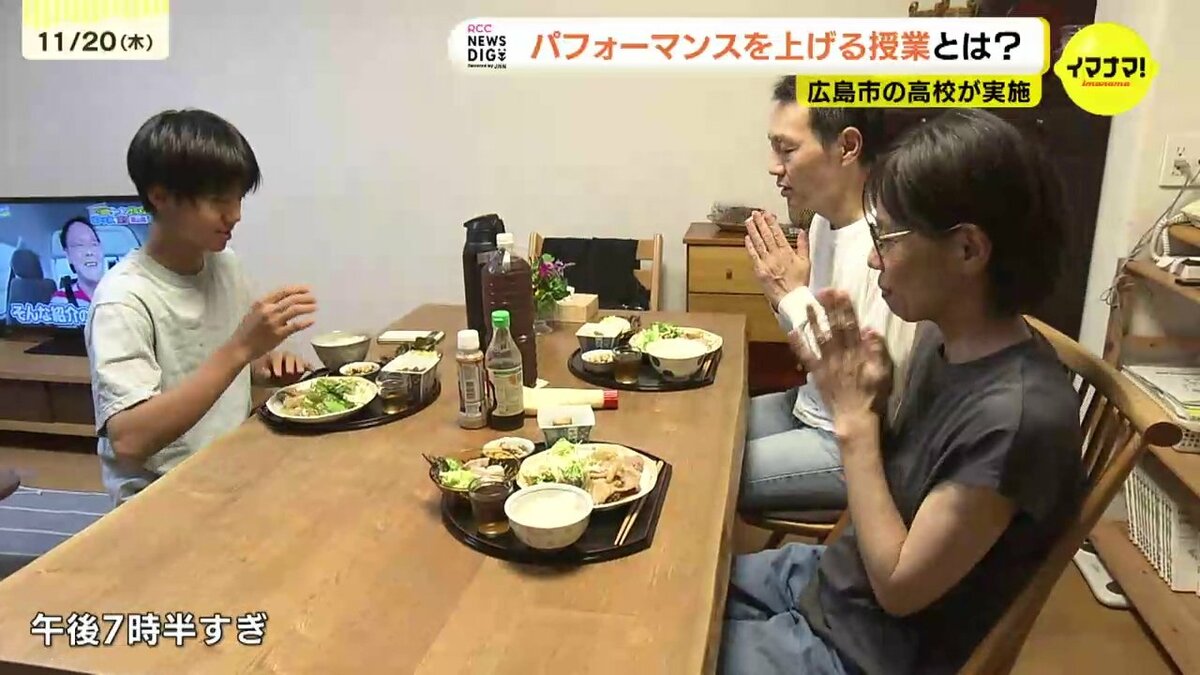 授業を終え、放課後はグラウンドで暗くなるまで野球部の練習に打ち込みます。夜7時半すぎ、帰宅後の夕食時には、さっそく家族との会話に「睡眠と栄養」の話題があがりました。