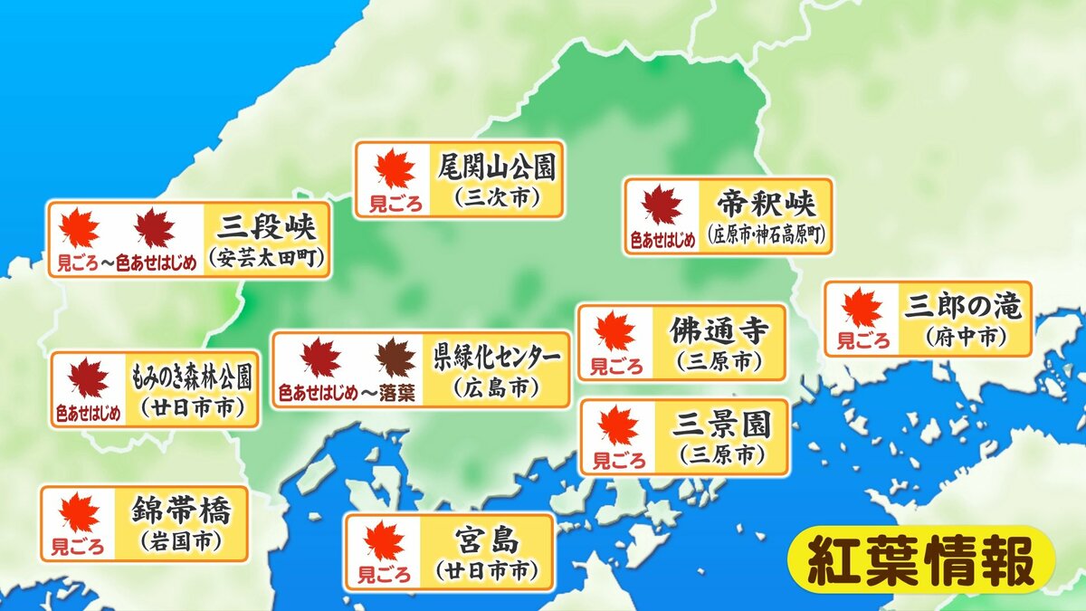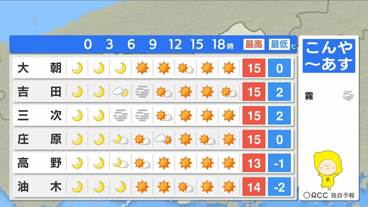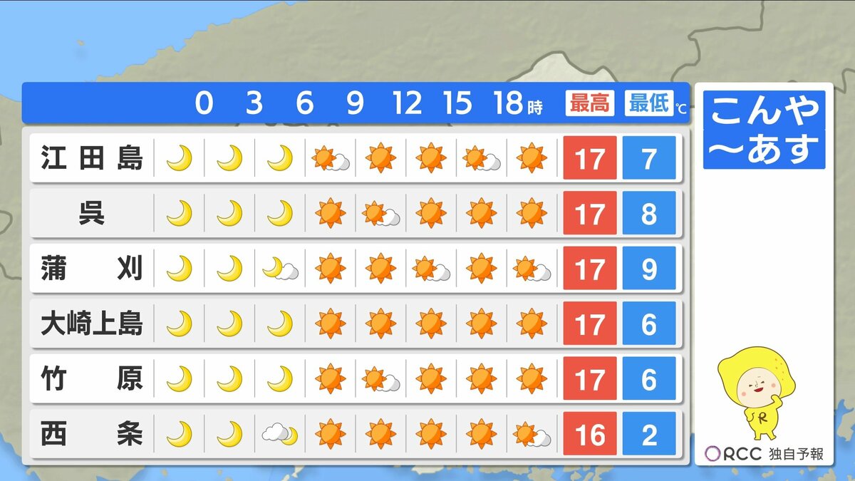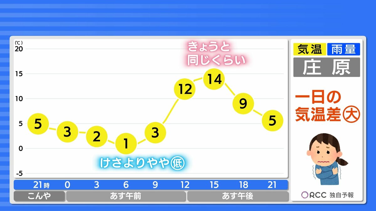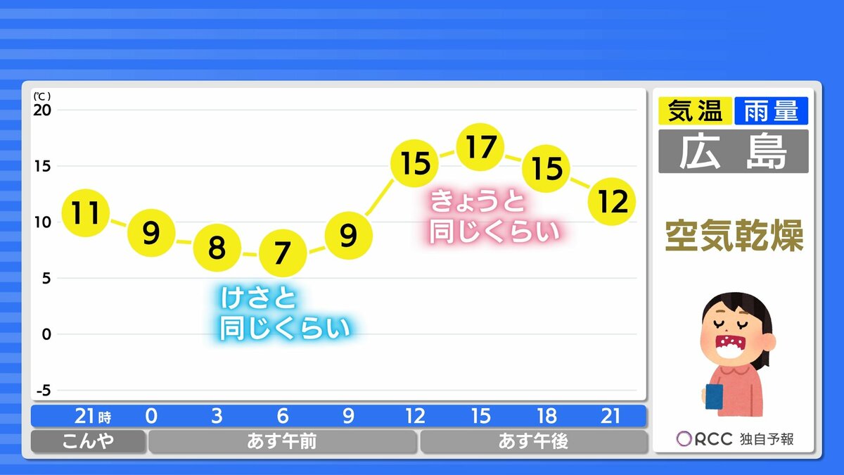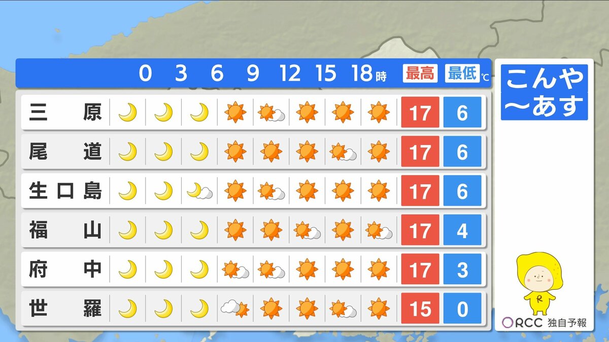 きょう21日(金)の広島県内は、日差しがよく届き、小春日和となりました。日中の気温は、福山市で19.6℃、広島市中区で19.0℃、各地平年よりも2~3℃高くなりました。ただ、今シーズン1番の朝の冷え込みのところもあり、1日の気温差が大きくなっています。