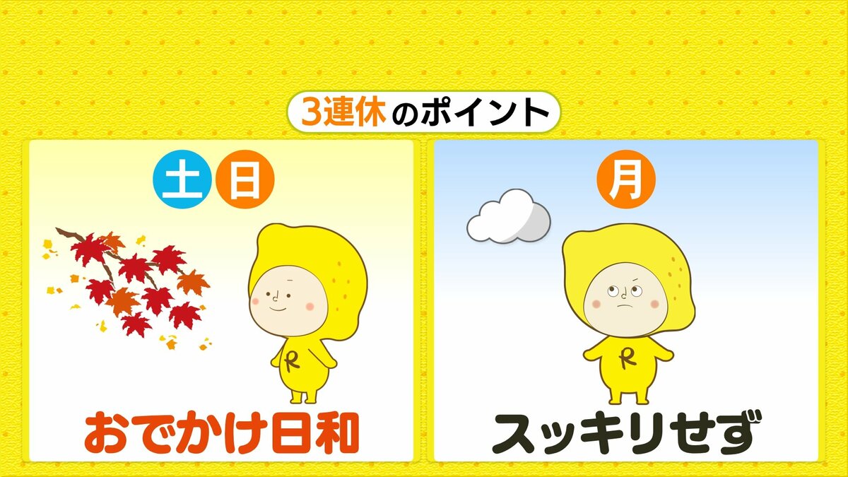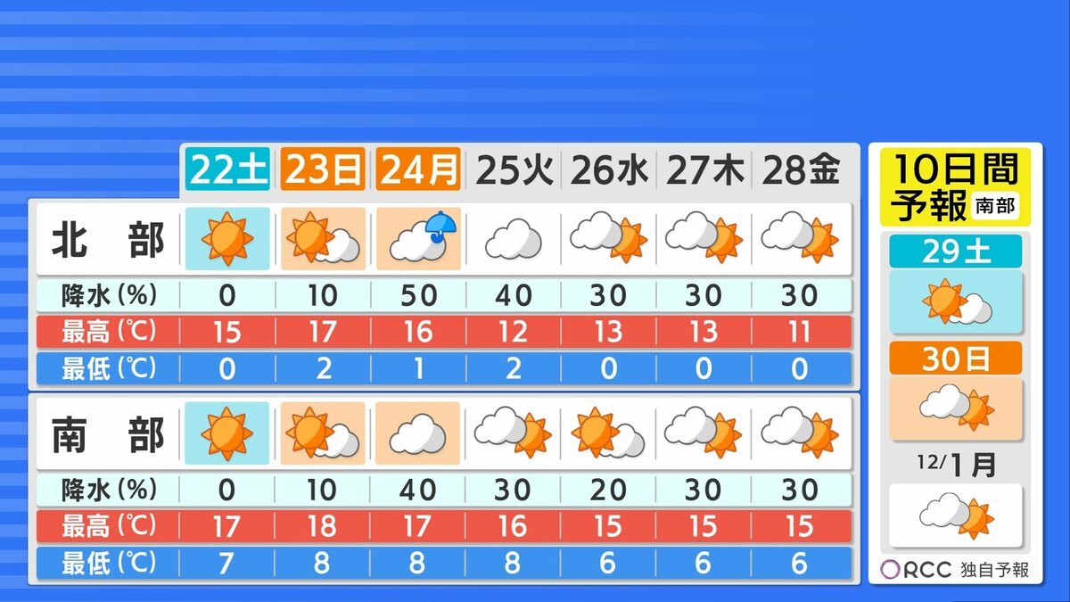 24日(月・祝)は、日本海を低気圧が進むため、雲が広がりやすく、北部ほど雨が降るタイミングが多いでしょう。火曜以降は、次第に日差しが復活する見込みです。また、火曜には上空に寒気が入るため、日中の気温が下がる予想です。寒暖差が大きい時期です。体調管理にはご注意ください。
