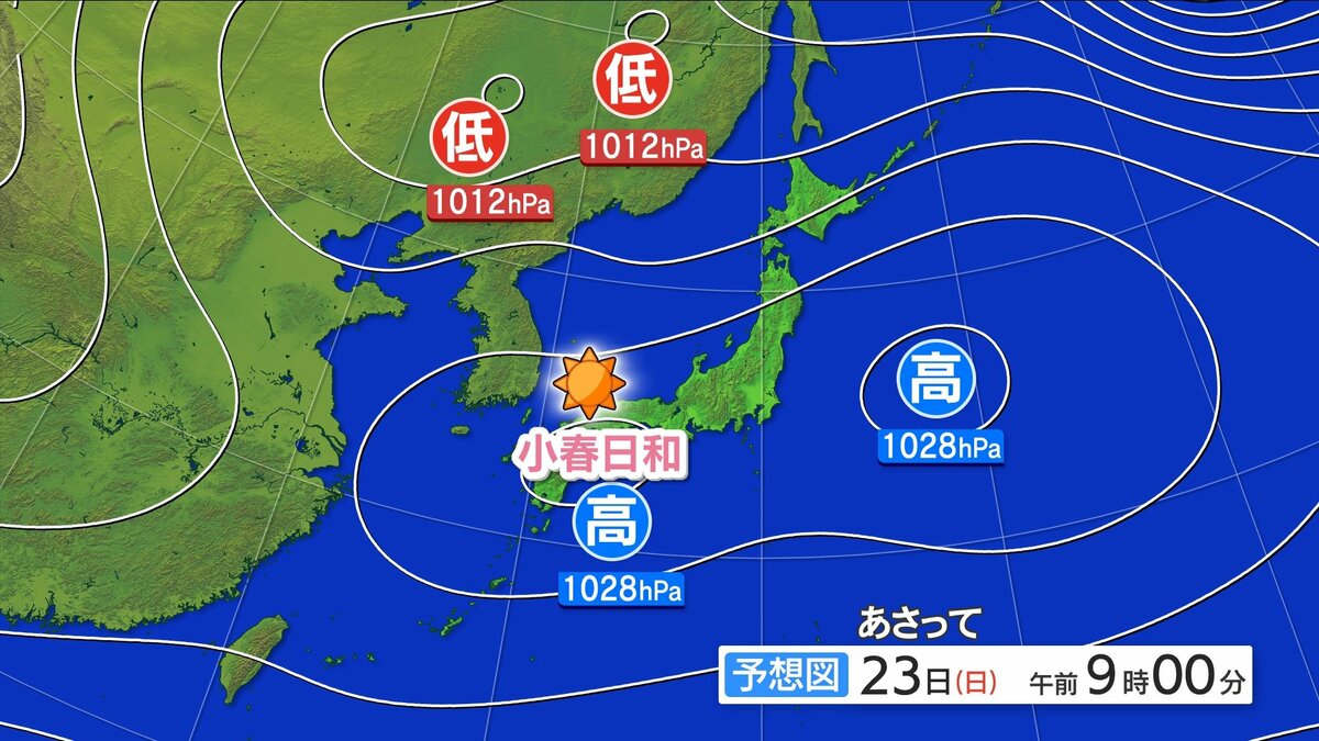あさって23日(日)も、高気圧に覆われて晴れる見込みです。お出かけ日和は日曜まで続く予想です。