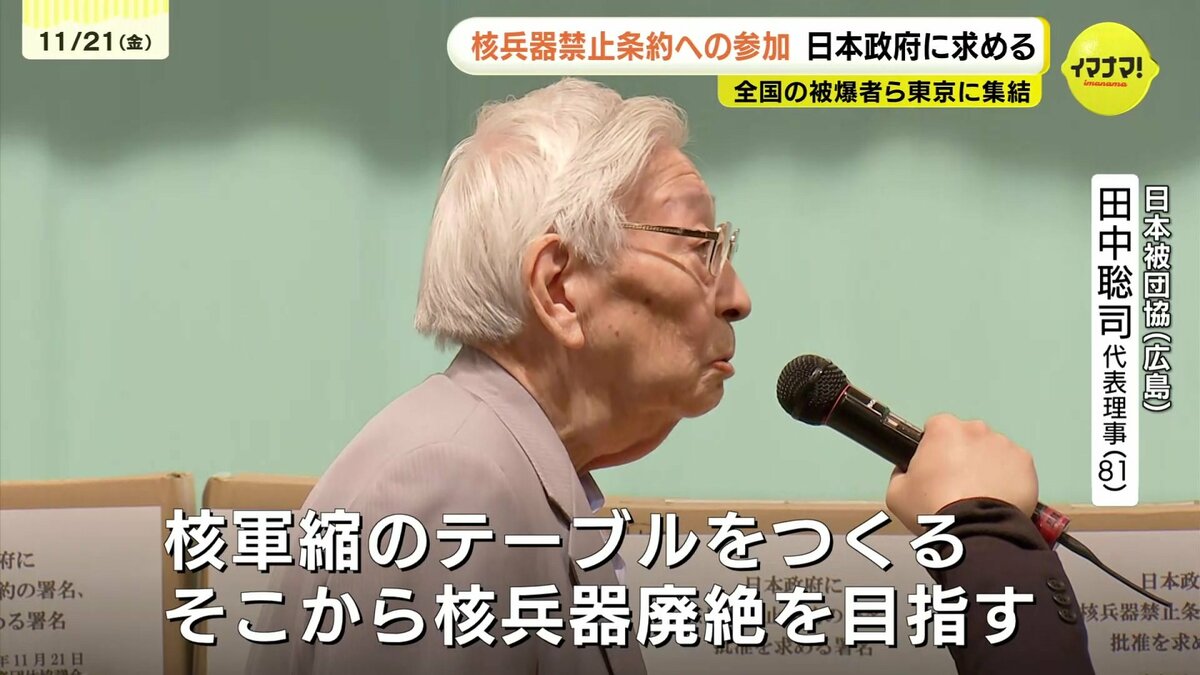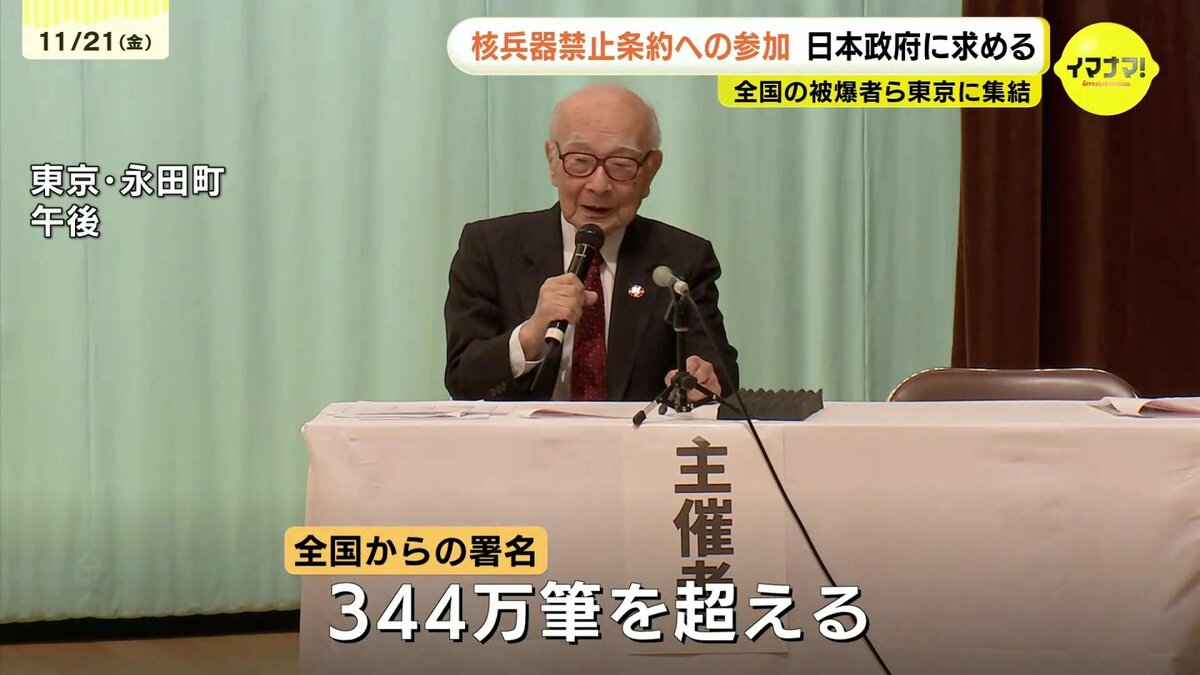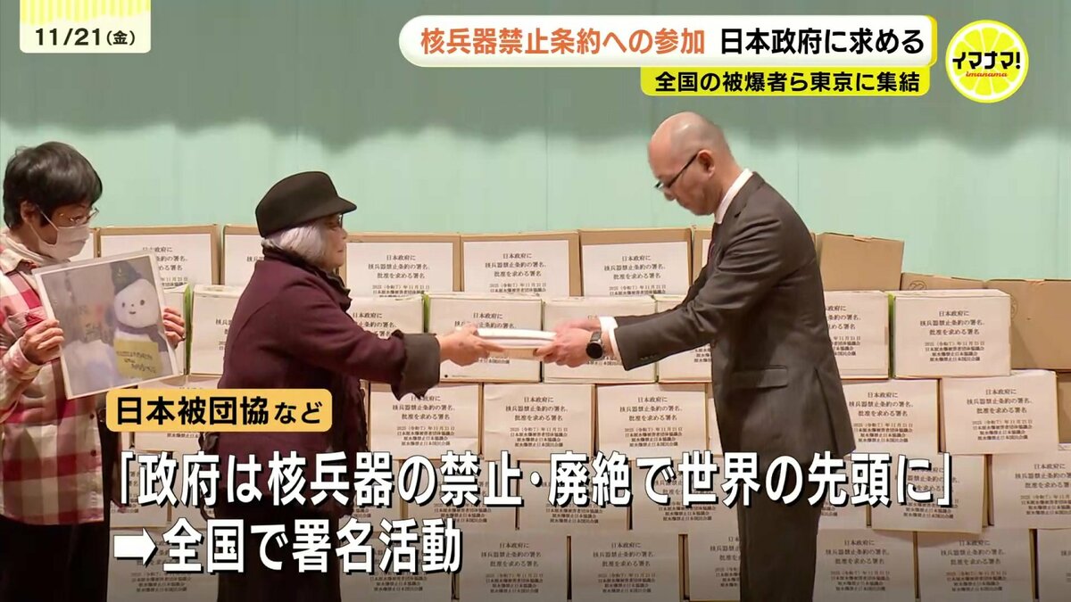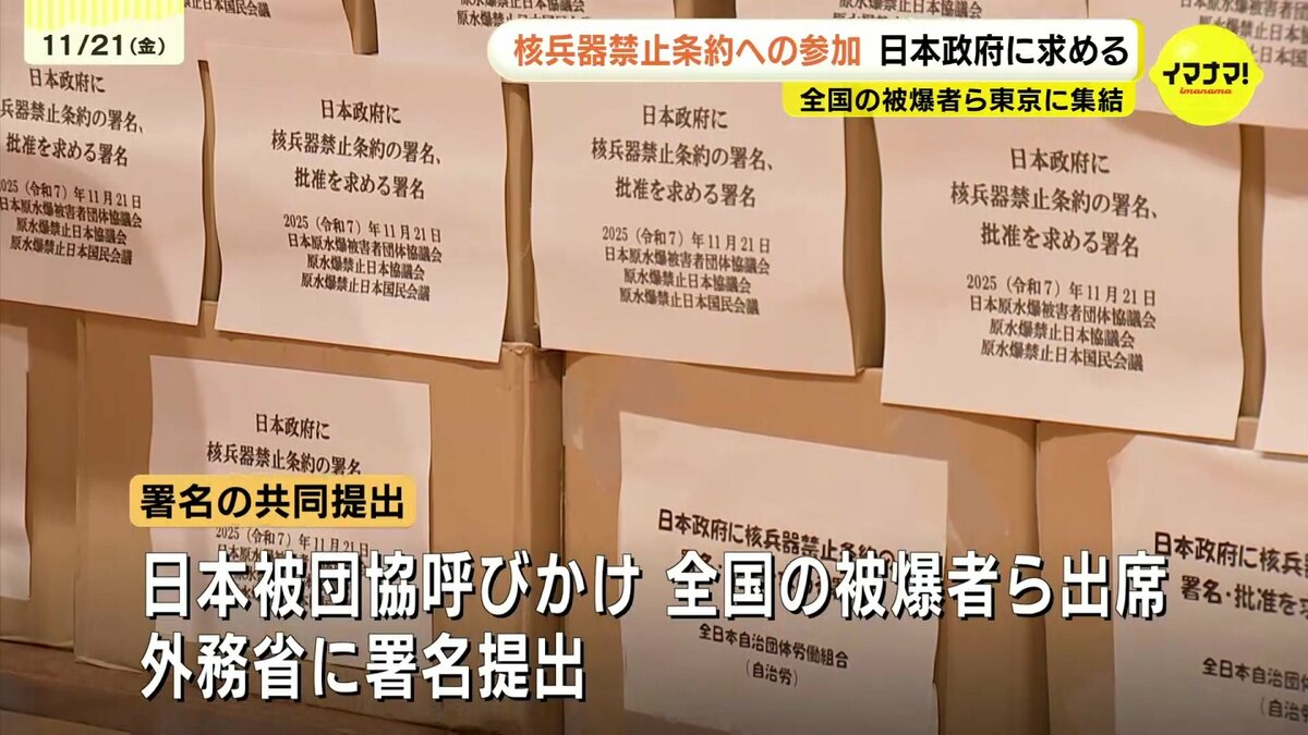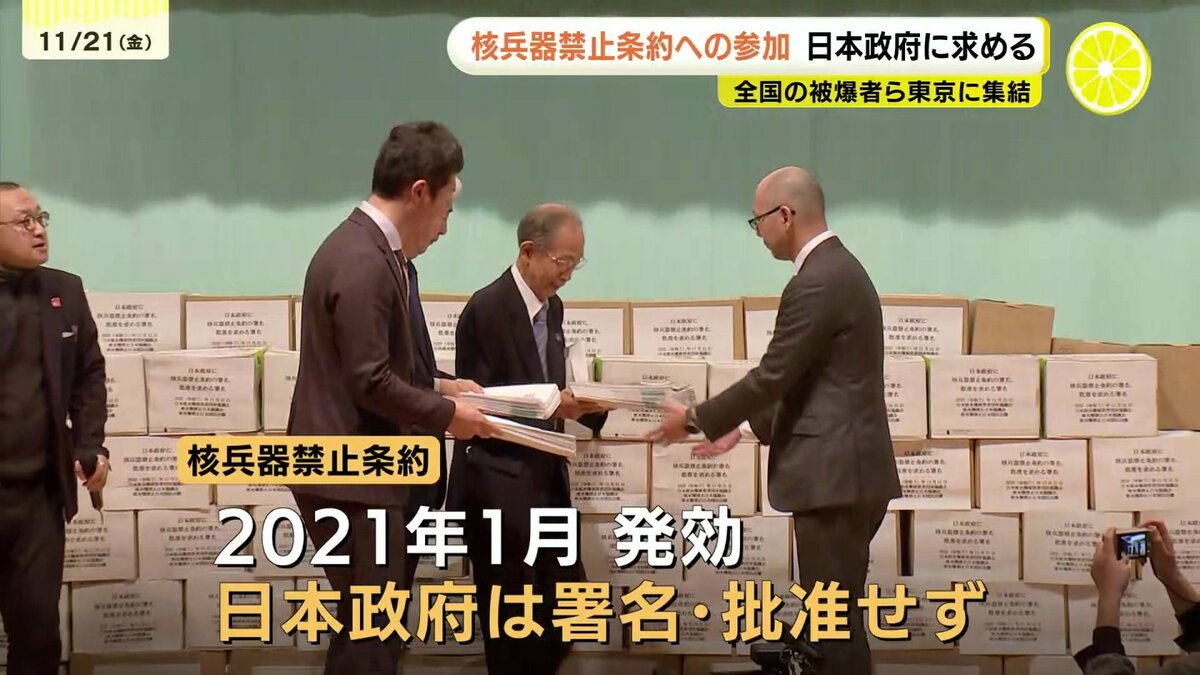 全国の被爆者などが21日、東京に集結し、日本政府に核兵器禁止条約に参加するよう求める署名を提出しました。