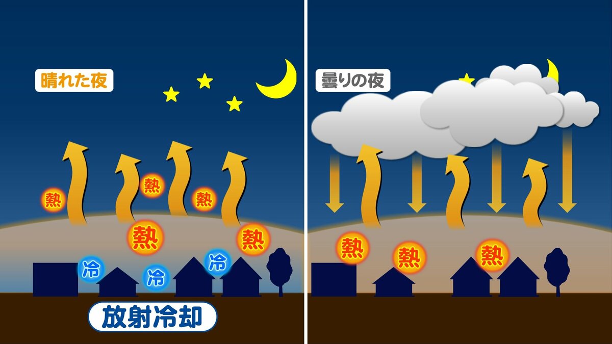晴れた日は、日中太陽からの熱が地表に多く届きます。この熱が、夜間に大気中に逃げていくのですが、晴れた日の夜は大気中と地表の間に遮るものが無いため、大量の熱がそのまま大気中に放出されてしまいます。
