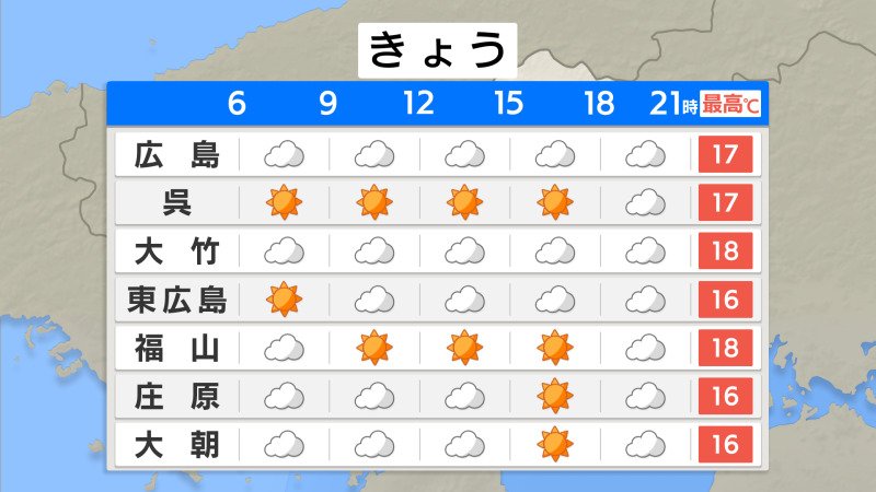最低気温は、広島市中区は7.9℃・庄原市1.2℃・神石高原町ー1.2℃など、きのうの朝と比べるとやや高いですが、けさも冬日の地点がありました。