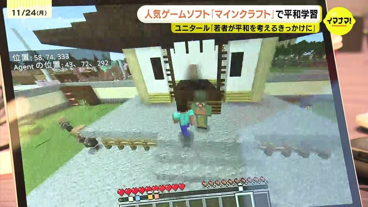 この後のワークショップでは、ブロックを自由に組み合わせて遊ぶ人気ゲームソフト「マインクラフト」を活用。参加者は原爆投下前の資料を参考にしながら、コンピューター上の仮想空間に、原爆で失われた街を再建しました。
