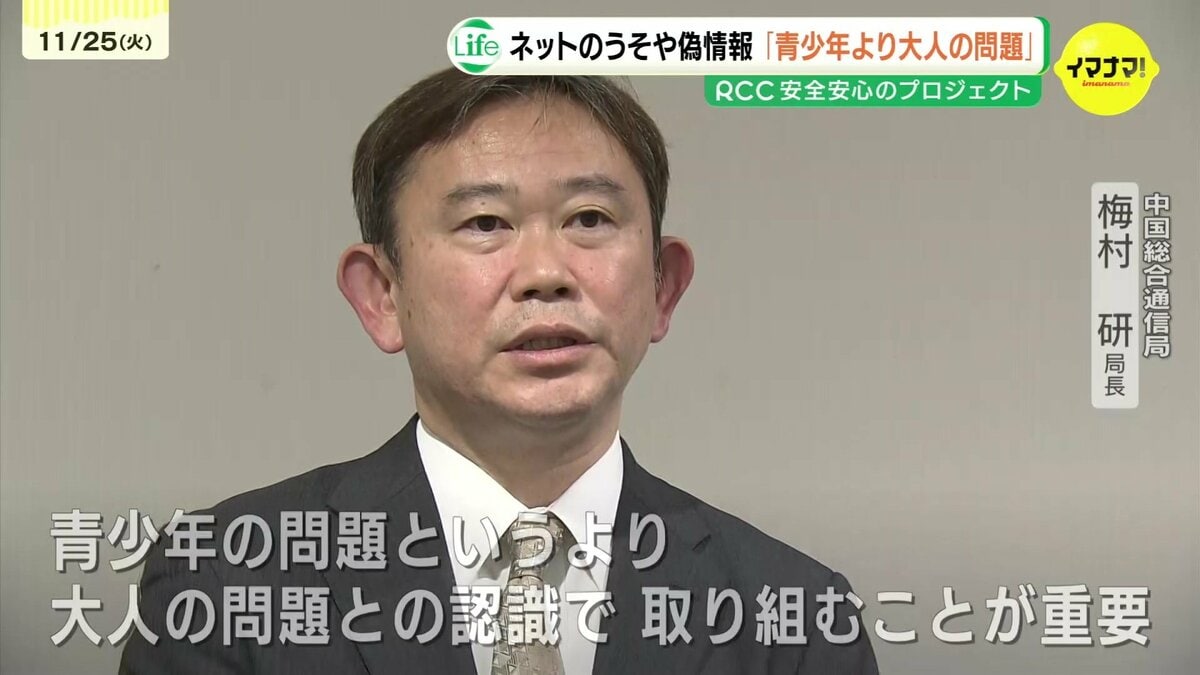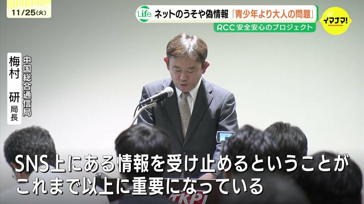 セミナーには企業や教育現場などからおよそ300人が参加しました。主催した総務省中国総合通信局の梅村局長は「SNSを中心にウソや誤った情報、いわゆる『偽・誤情報』の流通や拡散が社会的な課題」と指摘。あらゆる世代のICTリテラシーの必要性を訴えました。