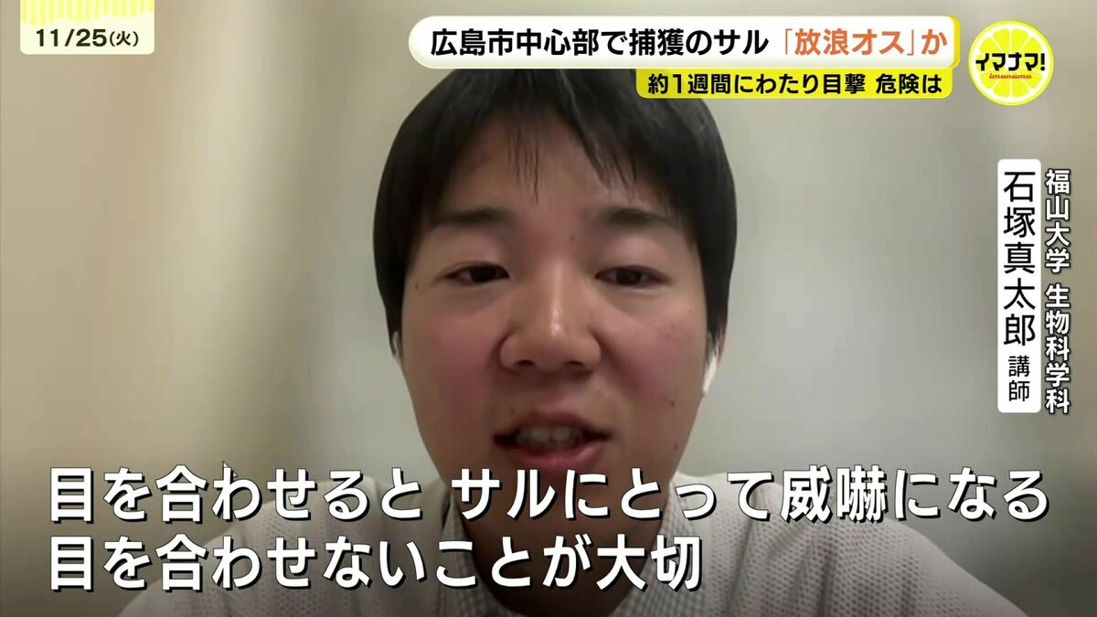 「血気盛んな個体もいますし、人に対して強気に出てくるような個体である可能性も否定できないと思います。やはりサルを刺激しないこと、目を合わせるとサルにとっては威嚇の意味になるので、目を合わせないことが大切です」