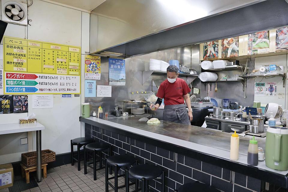 三条通りに、茶色いテント看板と懐かしいイラストが目印の「ポパイ お好みハウス」。〝自分だけのオリジナルメニューを楽しんで欲しい〟という思いから、「お好み肉玉」、「お好みそば肉玉」、「焼きそば肉玉」をベースに、好みのトッピングを自由に選ぶスタイルが特徴。