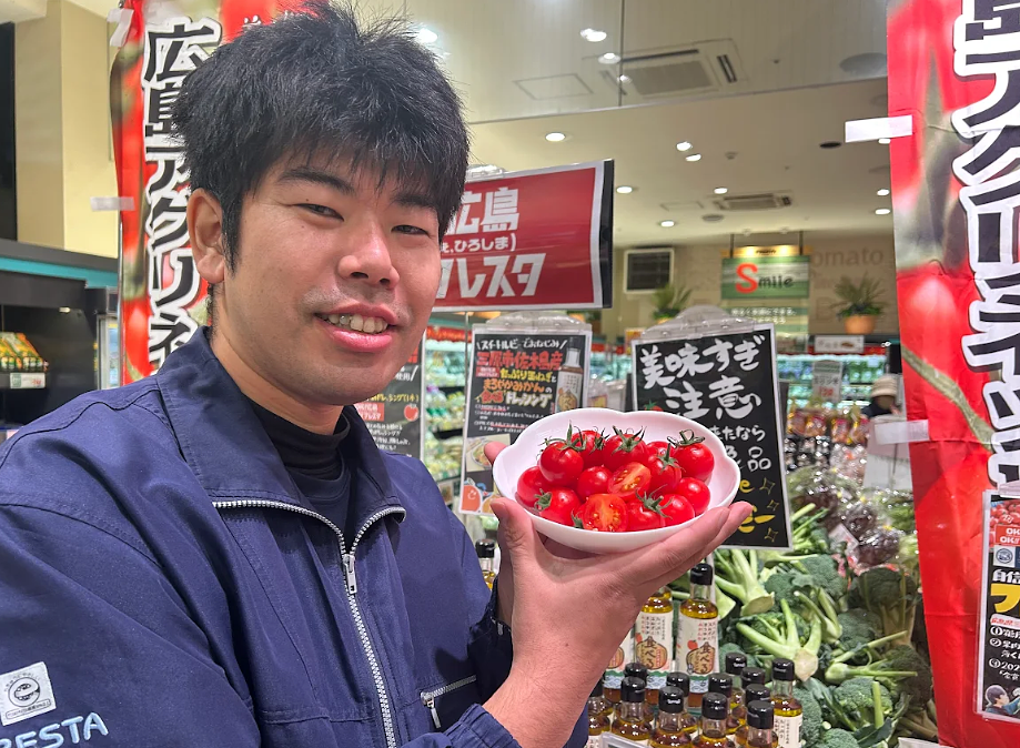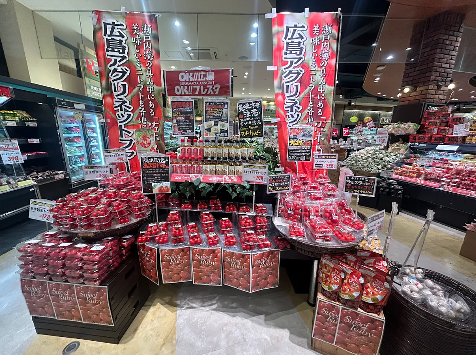 店頭に並んだのは三原市佐木島にある自社農場で栽培された「スイートルビー」。