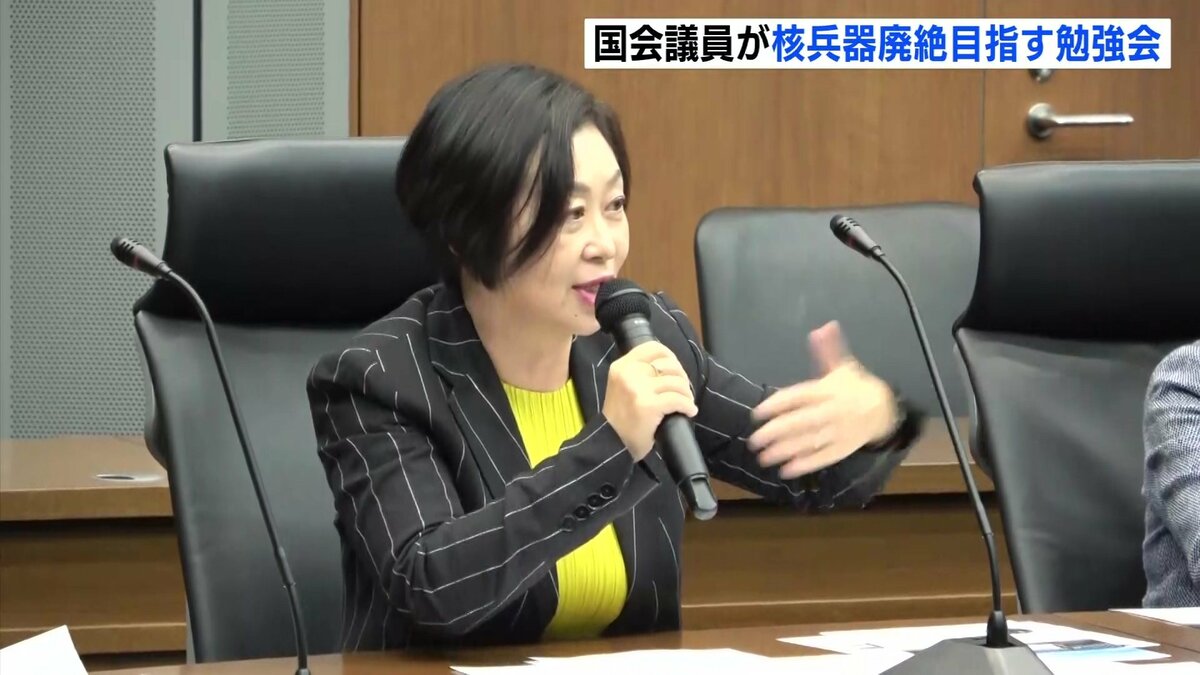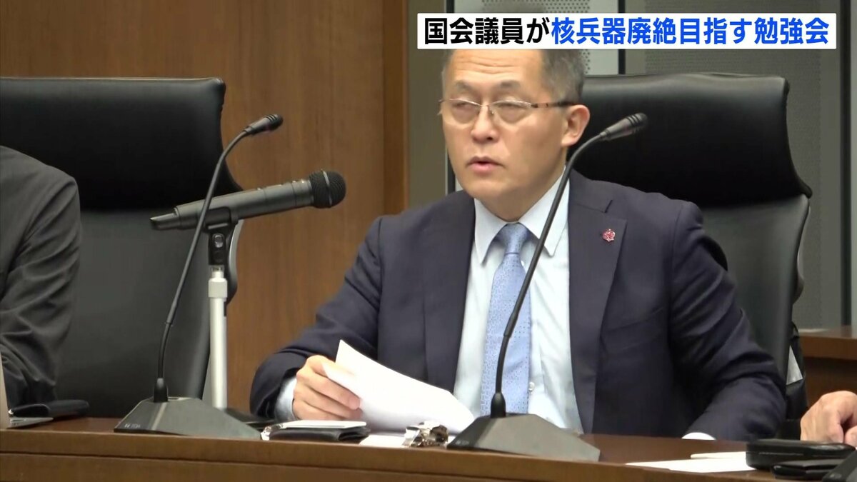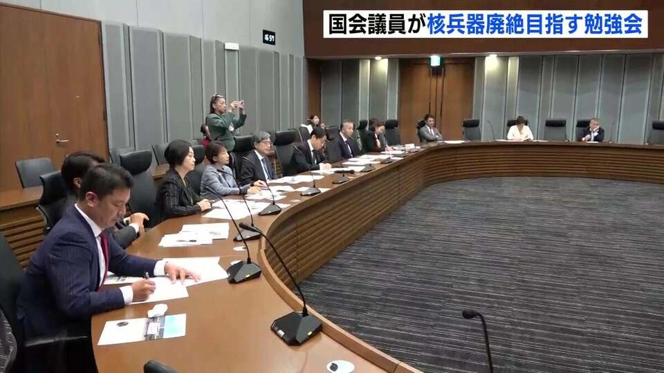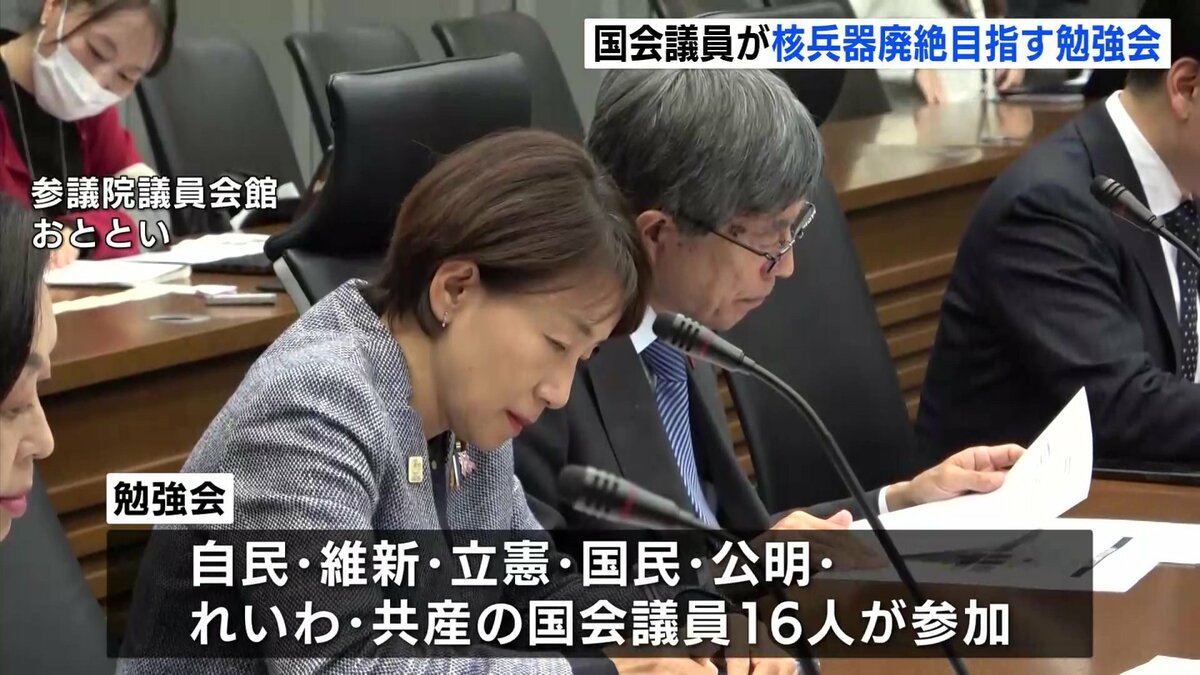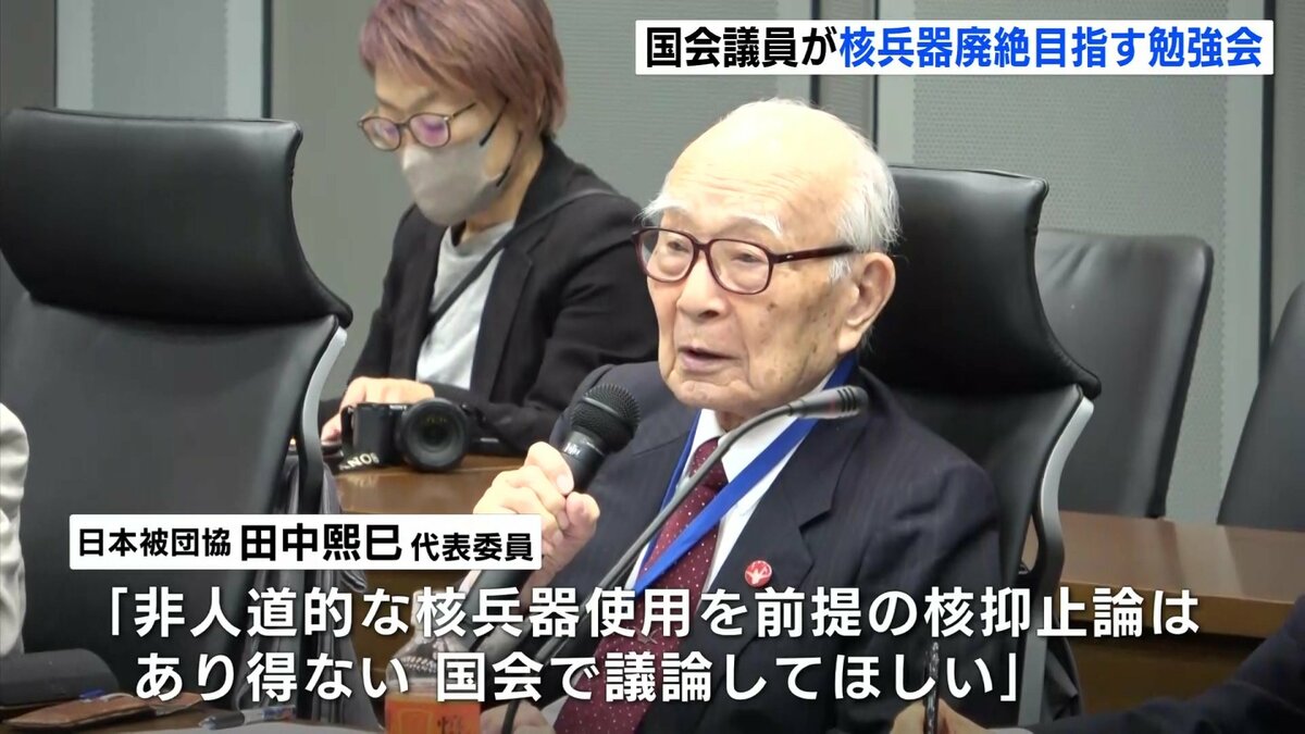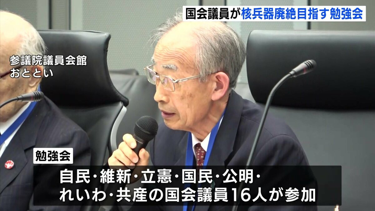 25日の勉強会には、自民・維新・立憲・国民・公明・れいわ・共産の与野党7党から、広島・長崎を含む16人の国会議員が参加しました。初会合に招かれた日本被団協の田中煕巳代表委員は、「非人道的な核兵器を使うことを前提にした核抑止論はあり得ない。国会で議論してほしい」と訴えました。