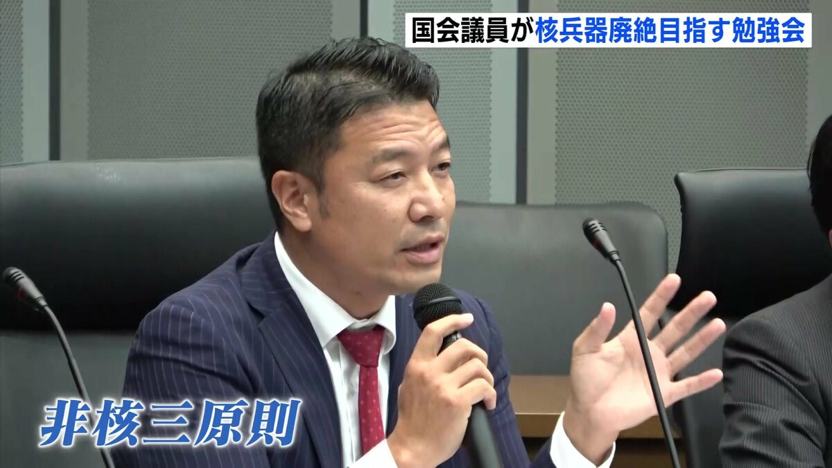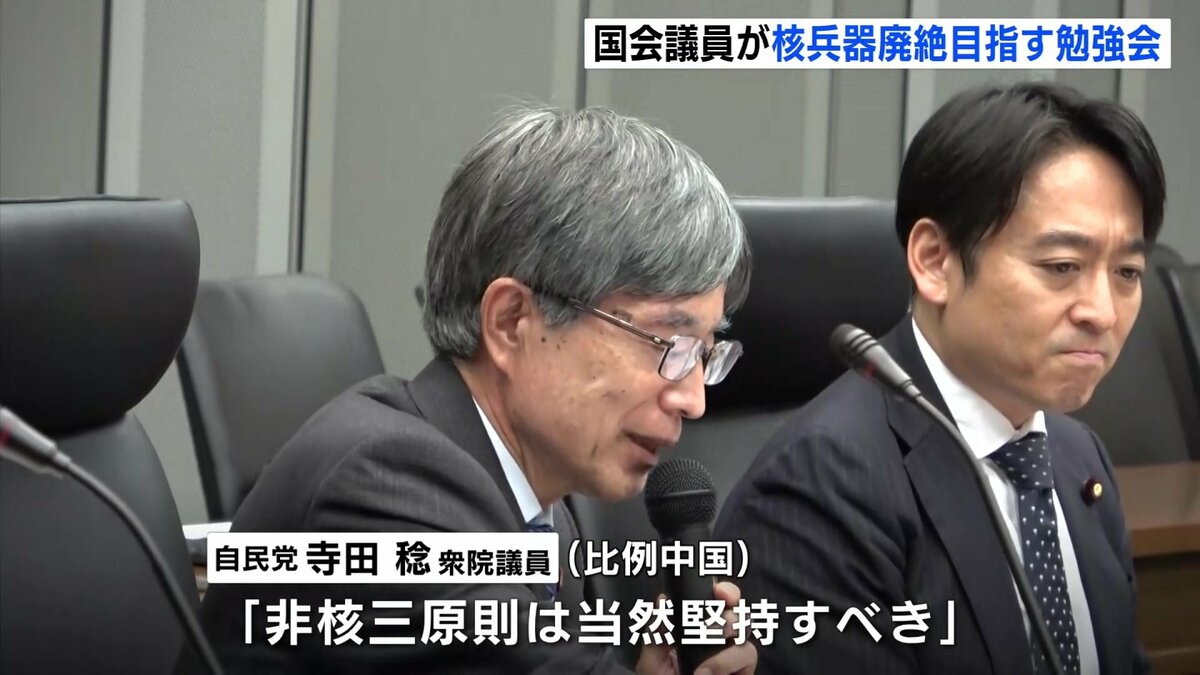「核兵器廃絶国際キャンペーンICAN」の国際運営委員・川崎哲さんが核兵器禁止条約の現状について講演し、議員からは意見や質問が相次いでいました。そのひとつが、非核三原則についてです。高市総理は見直しに含みを持たせていますが、被爆2世でもある自民党の寺田稔議員は、「当然堅持すべき」と主張していました。