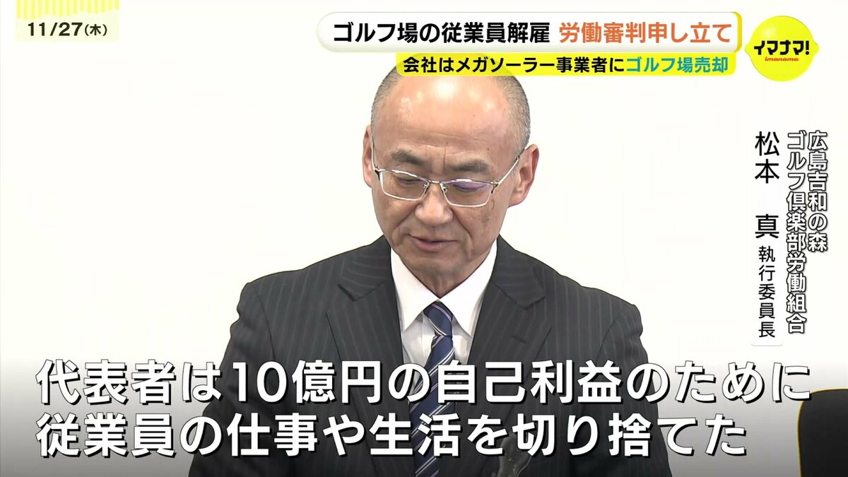 広島吉和の森ゴルフ倶楽部 労働組合の松本真 執行委員長は「会社代表者は10億円の売却代金を得るといった自己の利益のために、従業員の仕事や生活を切り捨てようとしている」と訴えました。