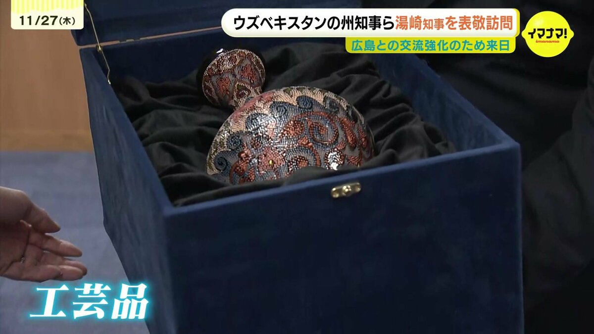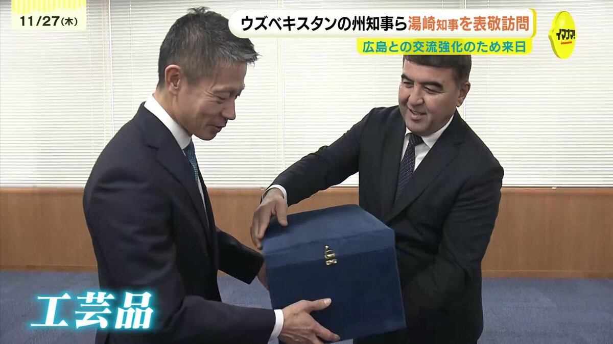 県内の企業がナマンガン州に進出している縁で、広島との交流を強化しようと訪れました。シャフカト知事は工芸品などを湯崎知事に贈りました。