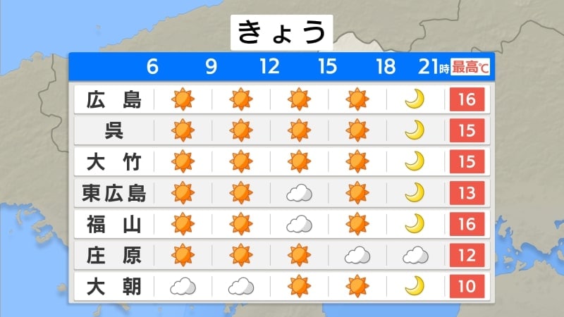 けさ(28日朝)の広島県内は、曇っている範囲が多くなっています。けさの冷え込みは弱く、呉で12.2℃ 広島市中区で11.7℃ 庄原6.4℃できのうと比べると4℃~5℃ほど高くなっています。