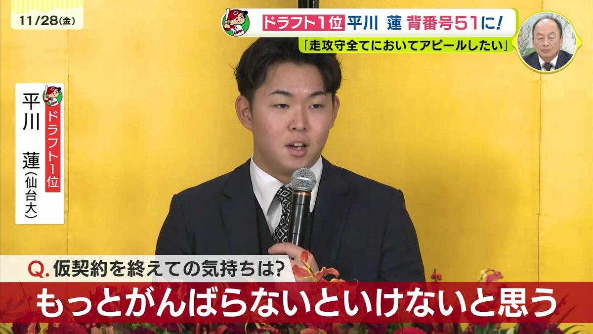カープがドラフト1位で指名した仙台大学の平川選手は両打ちの外野手で、大学ジャパンでは4番も任されました。また、大学のリーグ戦では盗塁王も獲得するなど俊足も持ち味で1年目から活躍が期待されています。交渉にはカープの近藤担当スカウトと高山スカウトが同席。契約金1億円年俸1600万円で仮契約を結びました。また、背番号は鈴木誠也選手や今年、首位打者を獲得した小園海斗選手などが1年目から背負った51番と発表されました。