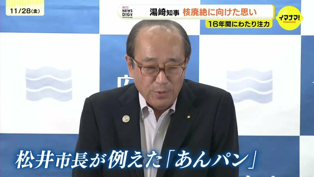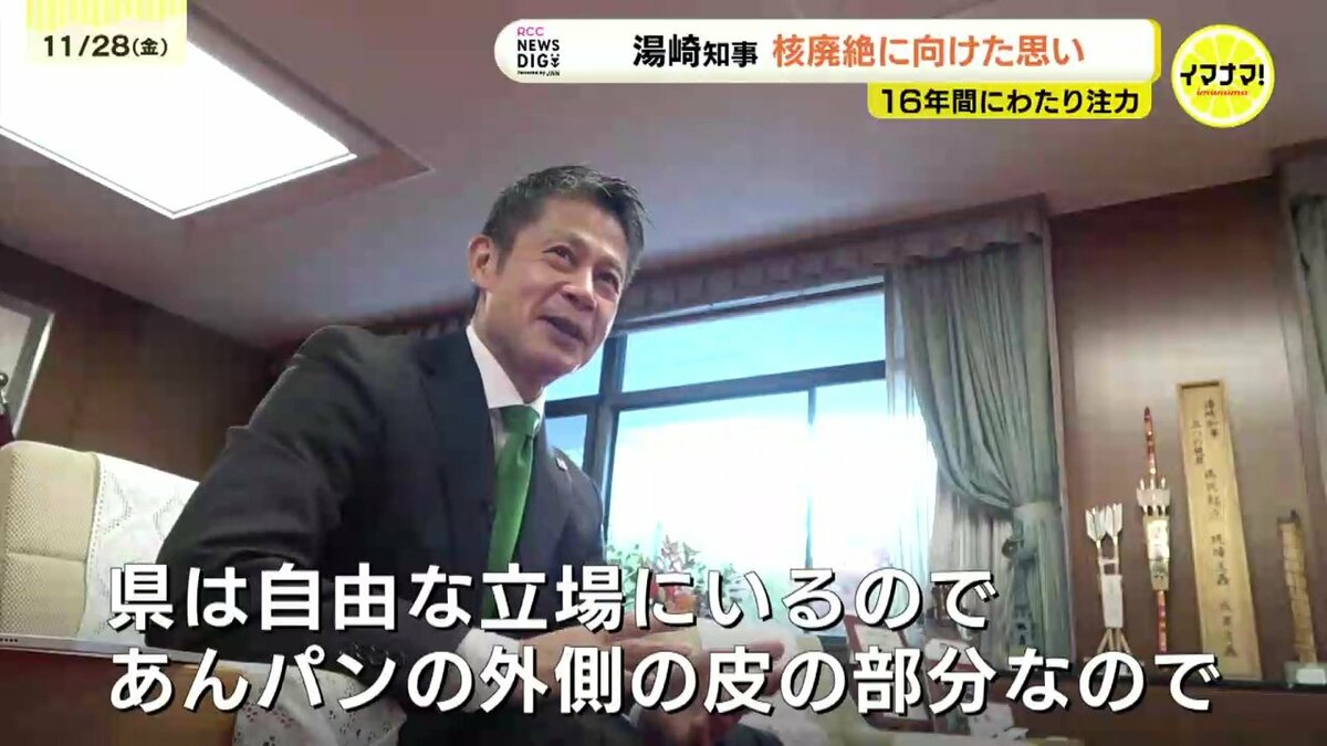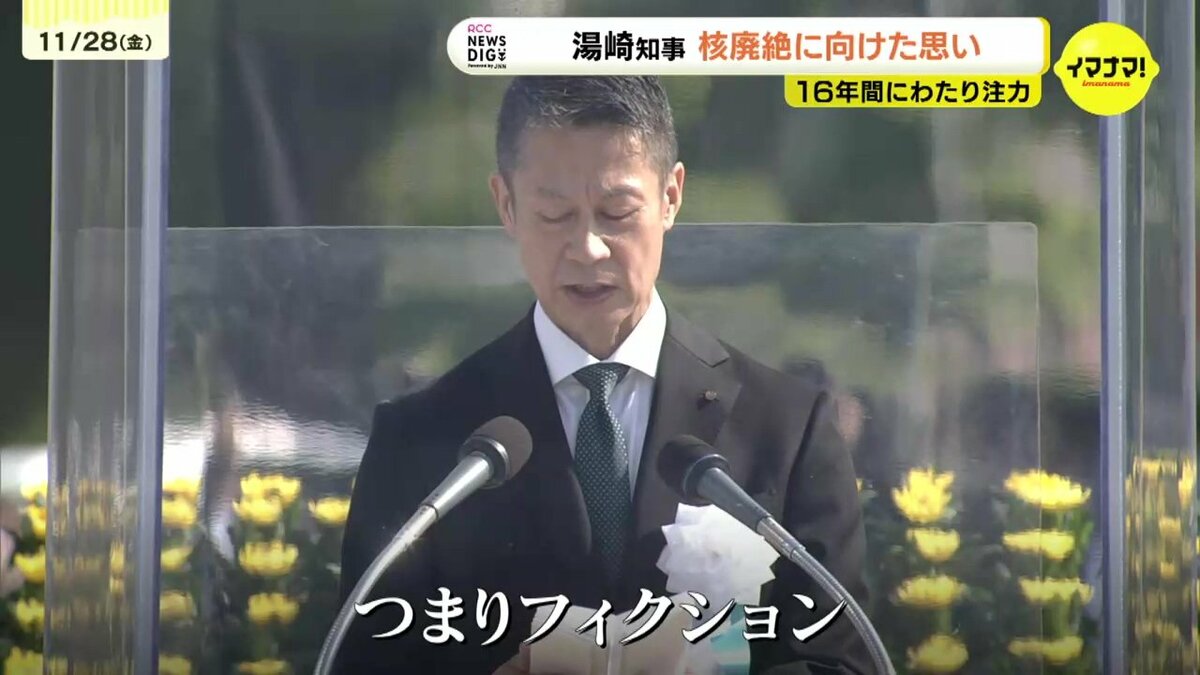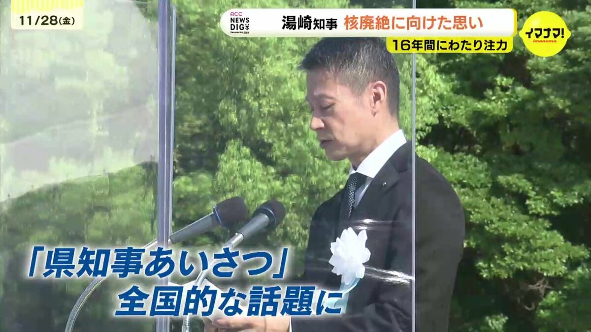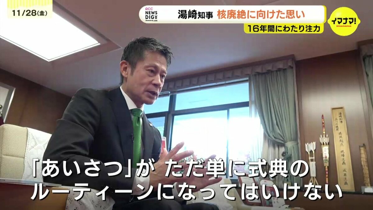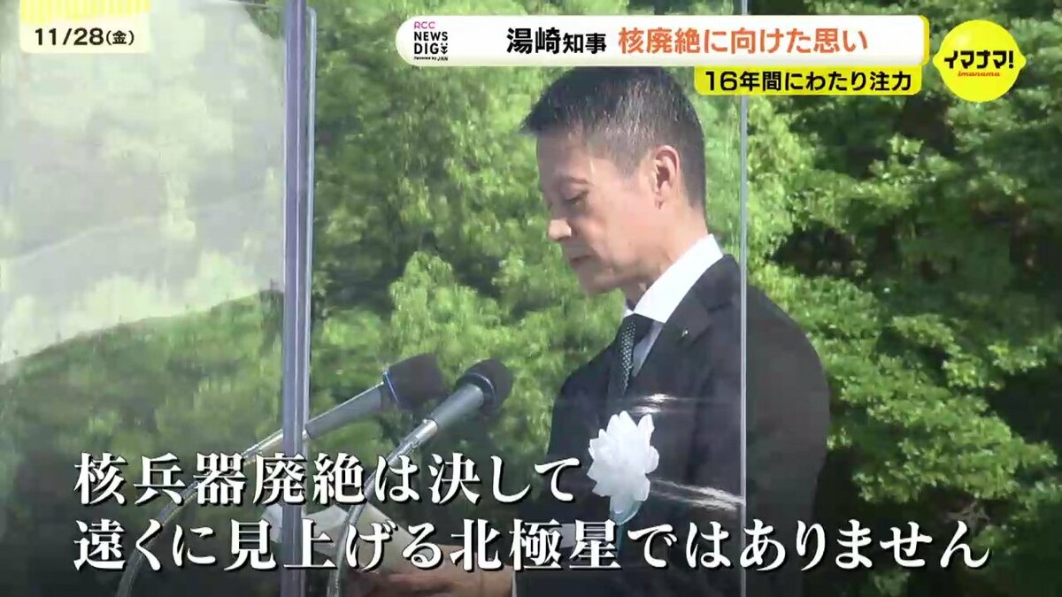 広島県の湯崎英彦知事は28日、4期16年の任期を終えました。知事として力を入れてきた施策の一つが平和問題です。ことしの平和記念式典での「あいさつ」で訴えた内容は全国的にも話題になりました。退任直前のインタビューで、核廃絶に向けた思いを聞きました。