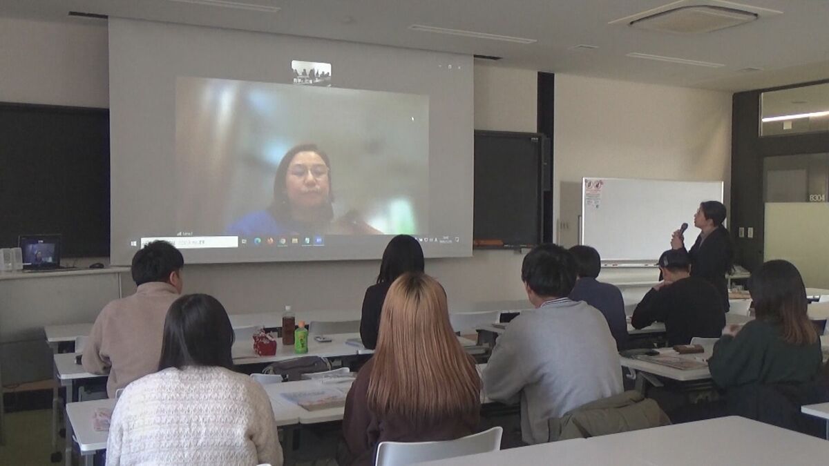 広島市の大学で11月下旬に開かれた講演会。オンラインで参加した藤井さんは、学生たちに自身の体験を語りました。