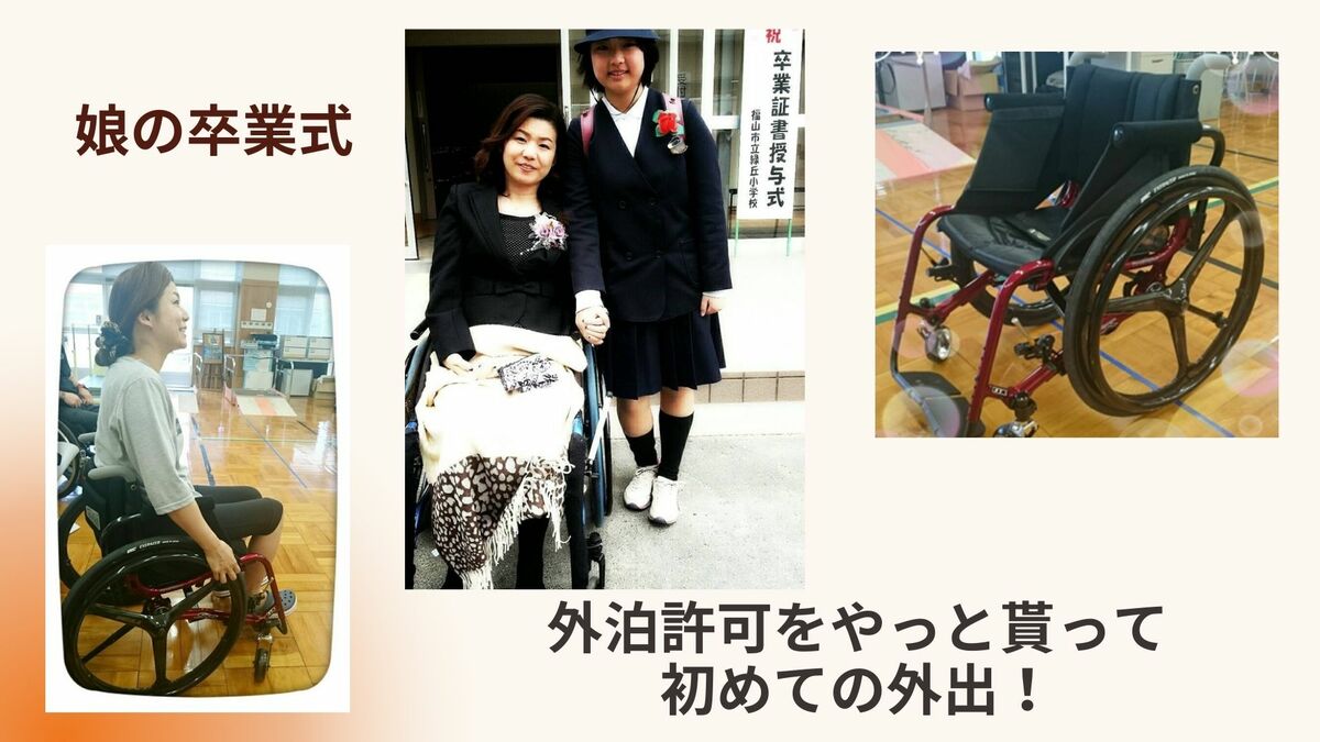 娘の卒業式に参加するには様々な条件がありました。体感がないため、圧迫による床ずれのリスクがあり、特殊なベッドのレンタルが必要でした。夜間も体位を変えるケアが必要で、周囲の協力なしでは外泊すら難しい状況でした。
