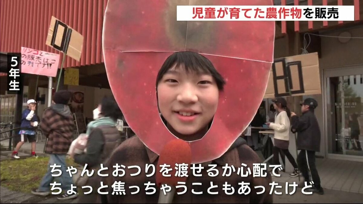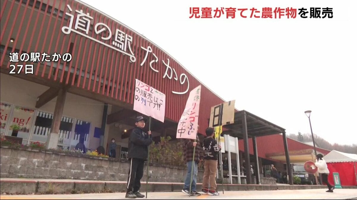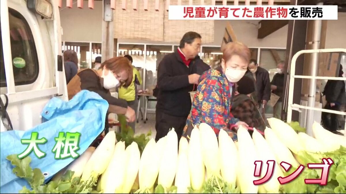 販売したのは高野小学校の児童27人です。販売開始から買い求める人たちの長い列ができました。大根は1本150円。リンゴは甘みと酸味のバランスが良い「ふじ」で、1袋750円です。