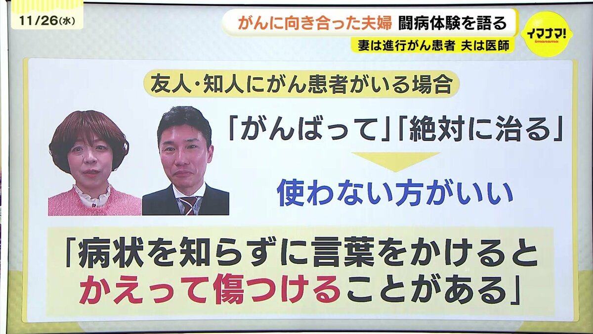 一方、聡さんは、患者の友人や知人として注意すべき点として、『頑張って』『絶対に治る』という2つのフレーズは使わない方がよいと指摘します。