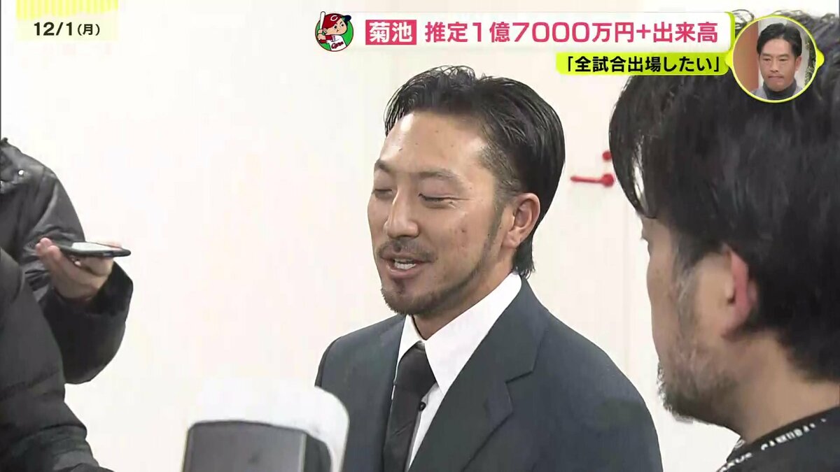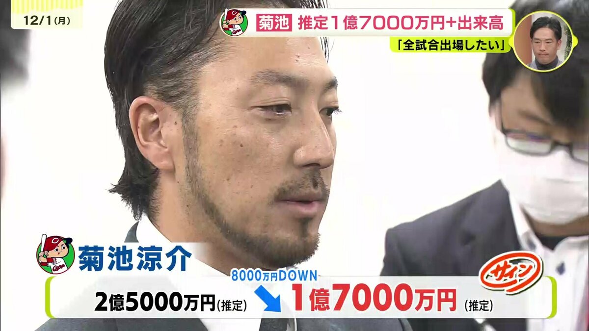 プロ14年目の菊池は2億5000万円から8000万円減の推定1億7000万円プラス出来高でサインしました。