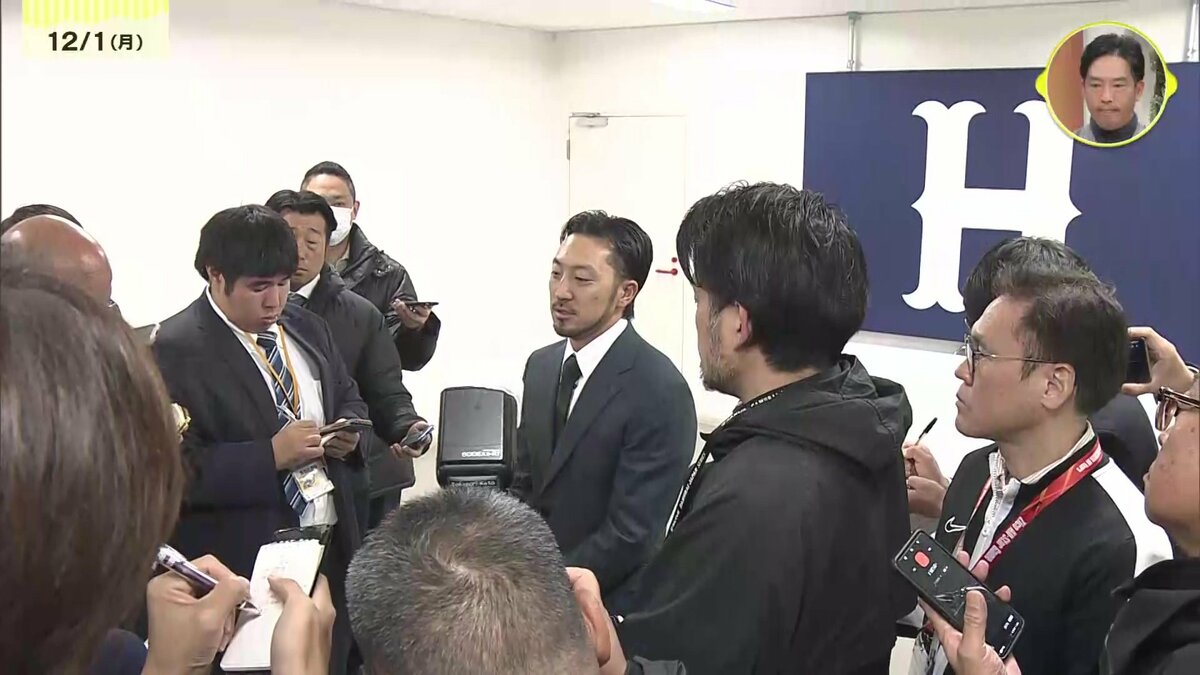 報道陣に対応する菊池選手