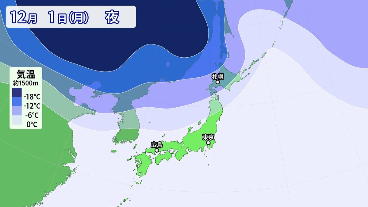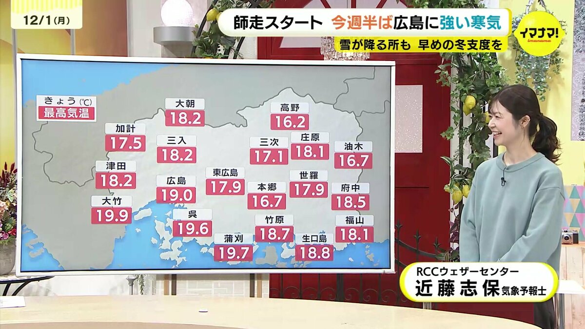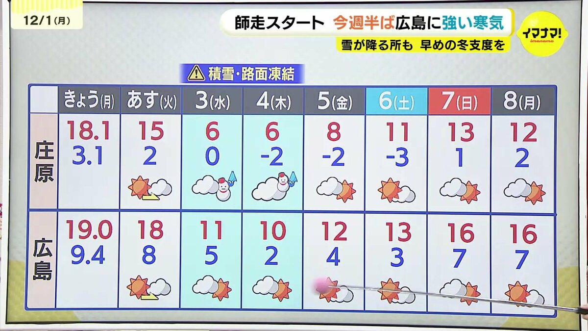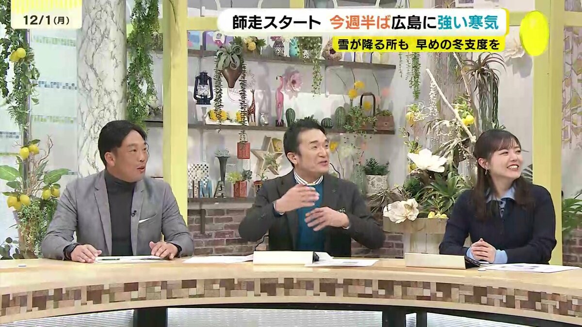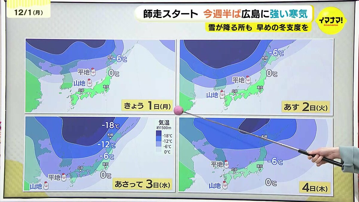 師走のスタートとなった1日、広島県内では、10月下旬から11月上旬並の気温となりました。このまま今年は暖冬か、と思いきや、今週半ばには、強い寒気がやってきて、今シーズン初のまとまった雪となりそうです。