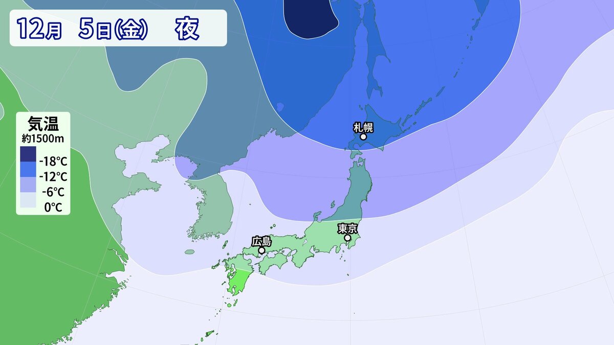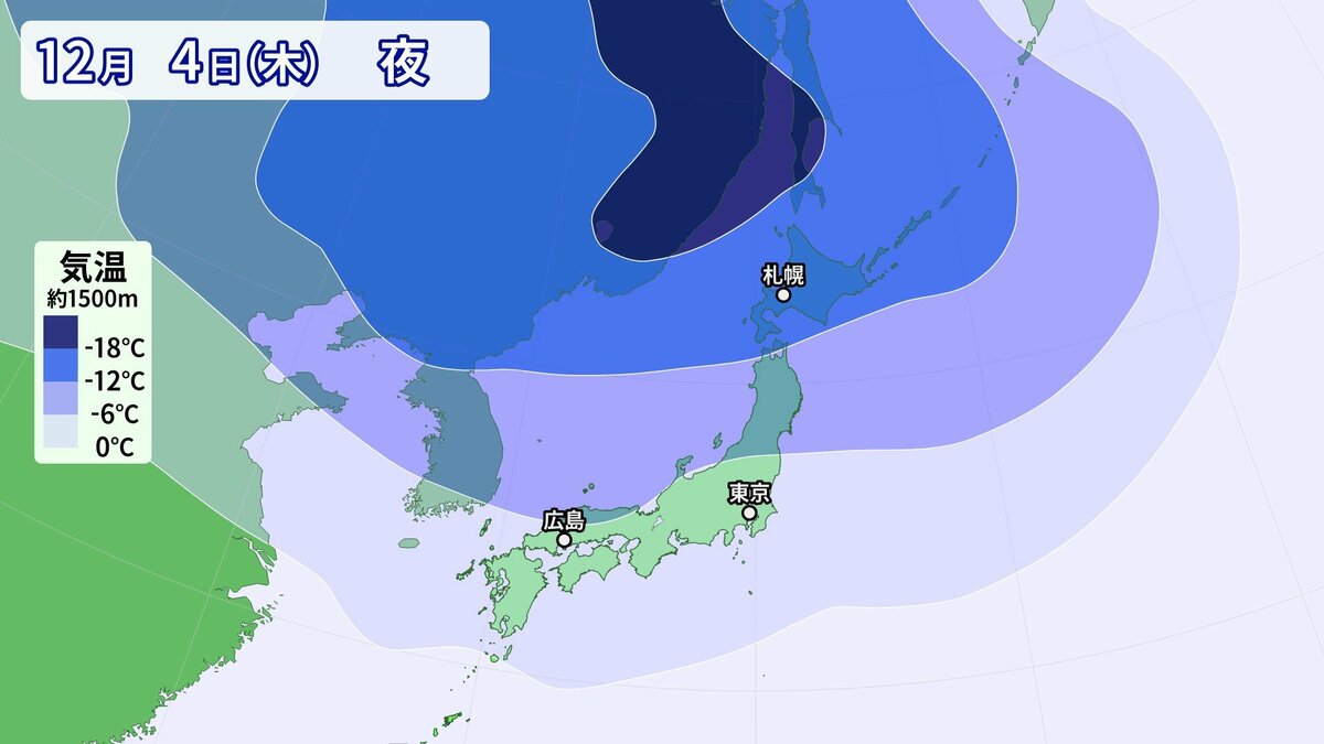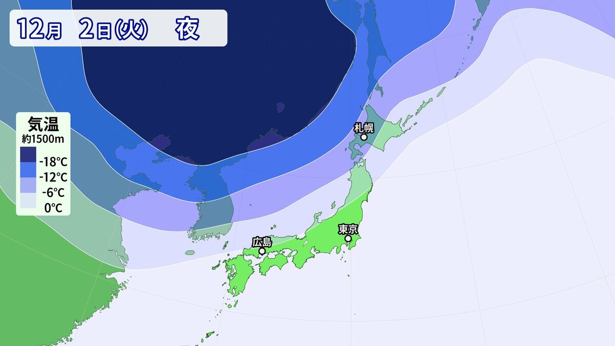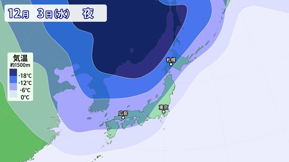 1日に季節外れの高温となった理由は、上空に寒気が入っておらず、この時期としては暖かい空気に覆われているためです。上空1500m付近の気温を見てみると、山地で雪を降らせる目安の0℃が、1日は北日本にのみかかっていますが、2日には広島県にかかり始め、3日には日本列島をすっぽり覆う見込みです。3日は、この寒気のピークとみられ、平地で雪を降らせる目安の-6℃以下の寒気が流れ込む予想です。そのため、3日(水)から4日(木)にかけて、山地を中心に今シーズン初のまとまった雪となり、平地でも積雪となる可能性があります。積雪や路面の凍結にご注意ください。