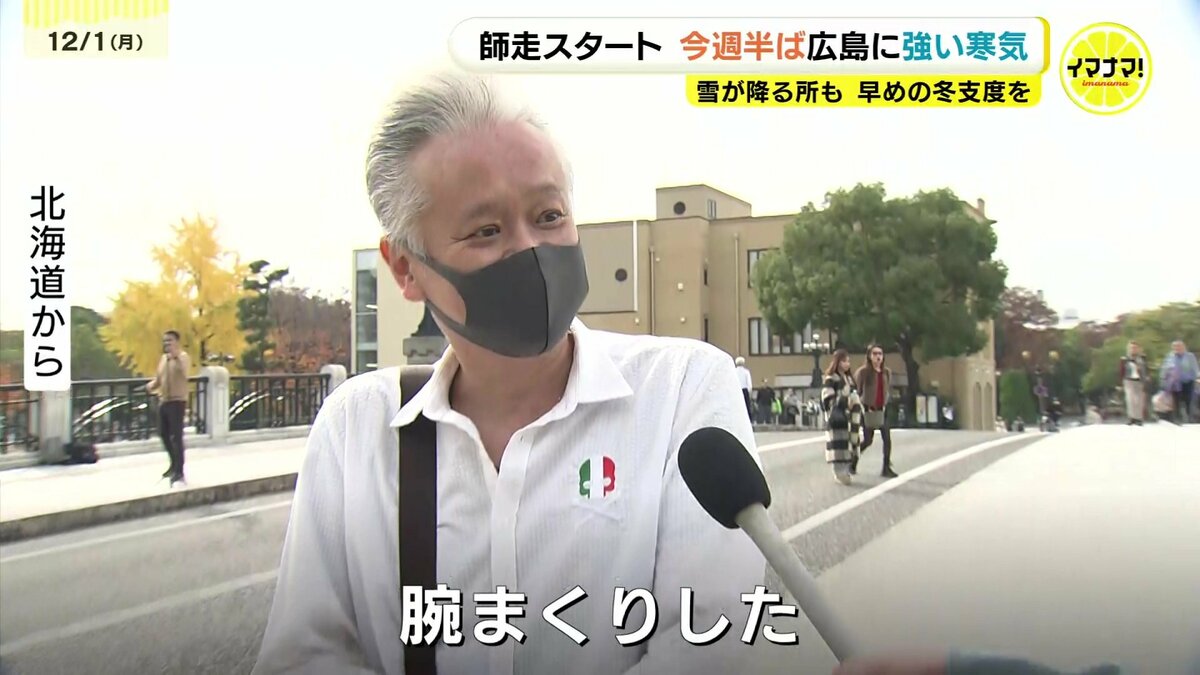 1日は大竹市で19.9℃、庄原市で18.1℃、県内各地で12月とは思えない最高気温となりました。平年とくらべると、5~7℃高くなっています。この陽気で、まちの人は上着を脱いで歩いていました。