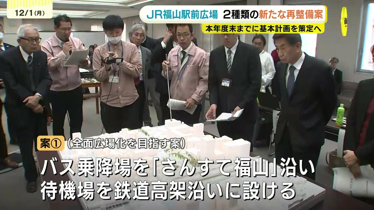 1日の官民協議会では新たな2種類の案が示されました。一つ目の案は全面広場化を目指すもので、バス乗降場を商業施設「さんすて福山」沿いに、待機場を鉄道高架沿いに設けます。事業費は50億円を見込みます。