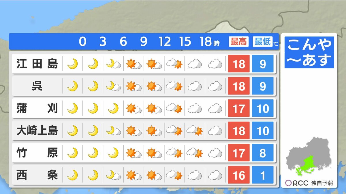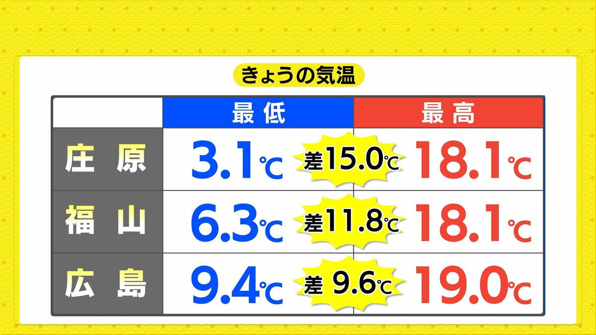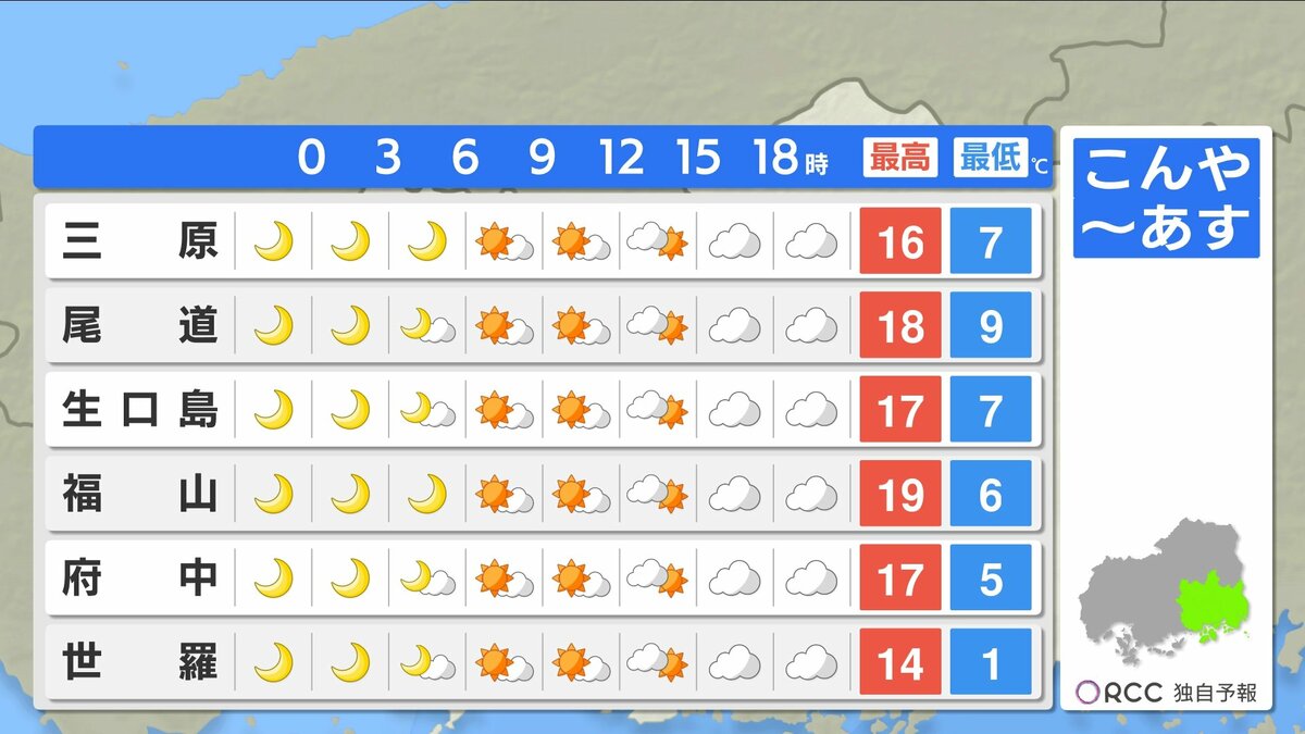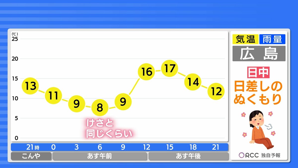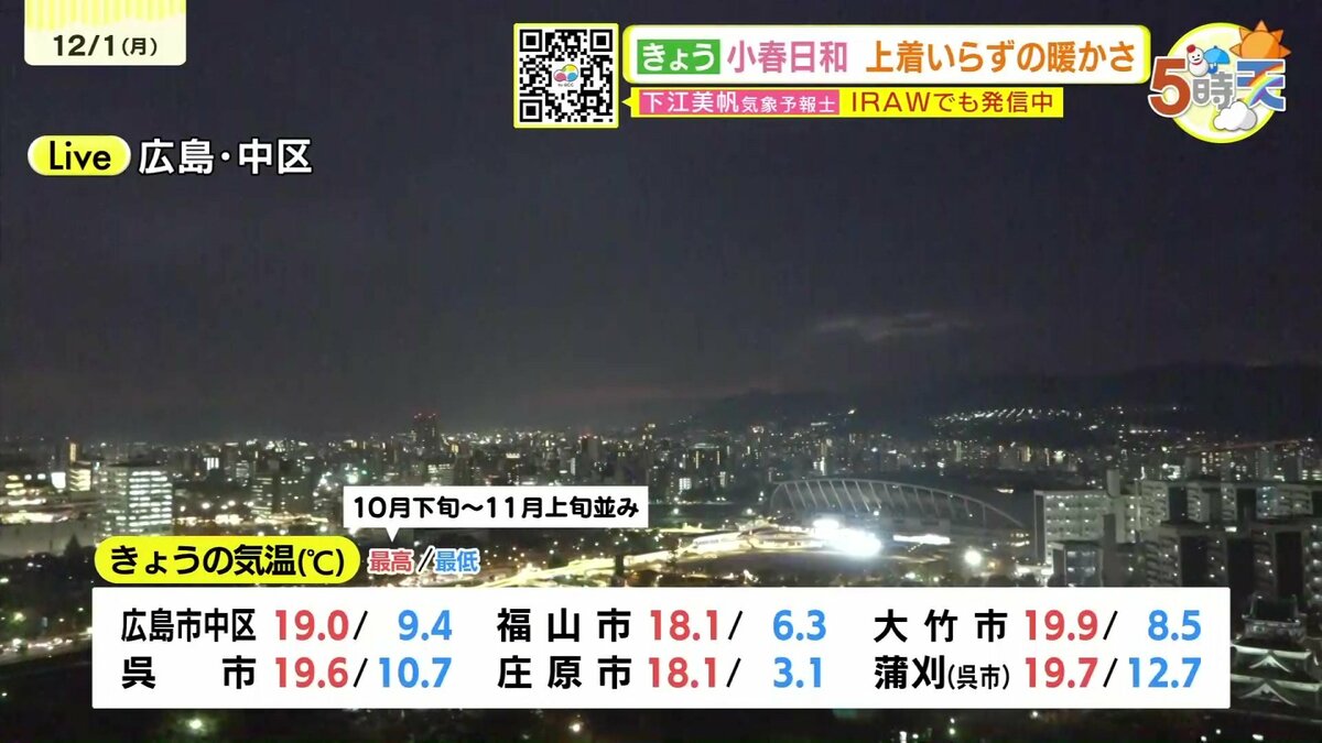 きょう12月1日(月)の広島県内は、一日雲が広がりやすくなりました。最高気温は、20℃に迫った地点もあり、各地で10月下旬から11月上旬並の暖かさとなりました。