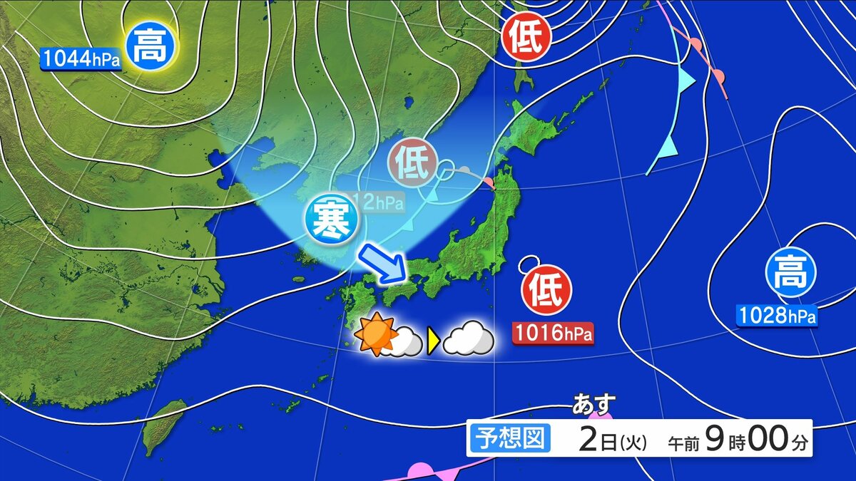 あすは高気圧の影響で午前中ほどよく晴れますが、日本海を前線や低気圧が通過した後、西から寒気が徐々に流れ込み、冬型の気圧配置に変わっていくでしょう。このため、午後ほど雲が厚くなっていく予想です。