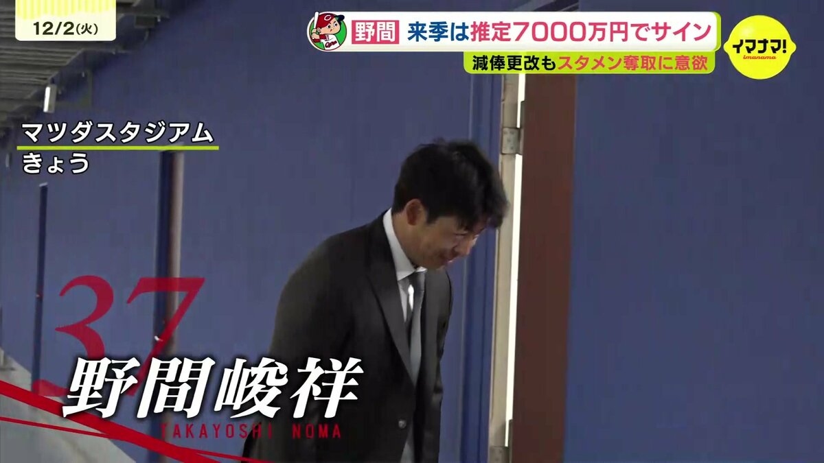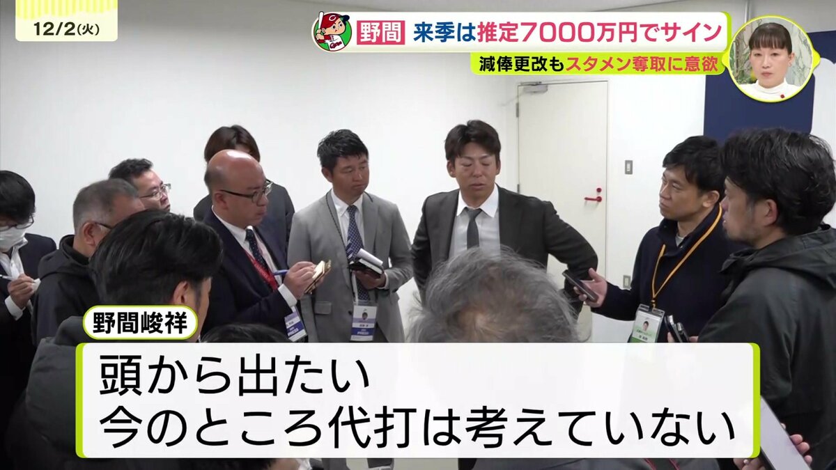 主に代打として起用された野間は8000万円から1000万円減の推定7000万円でサインしました。