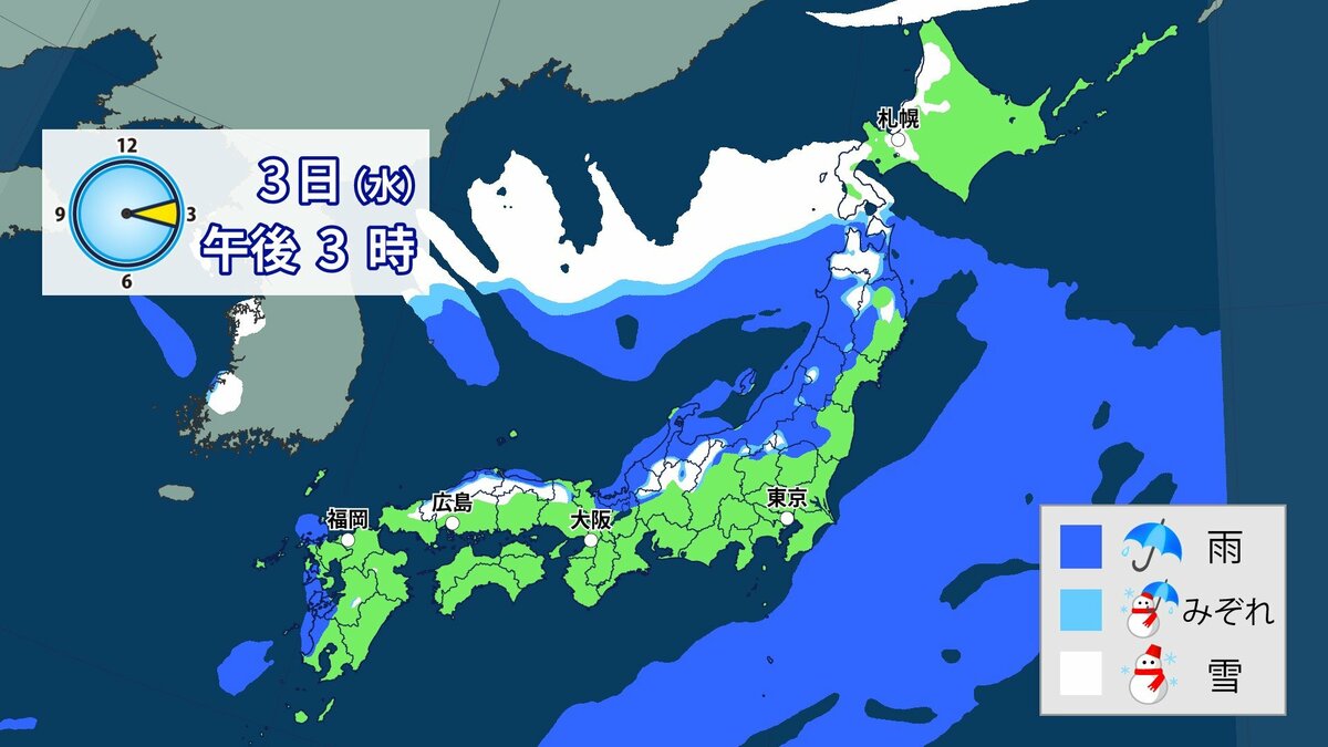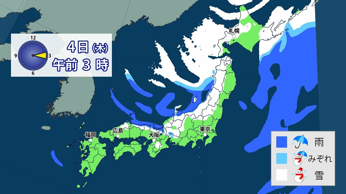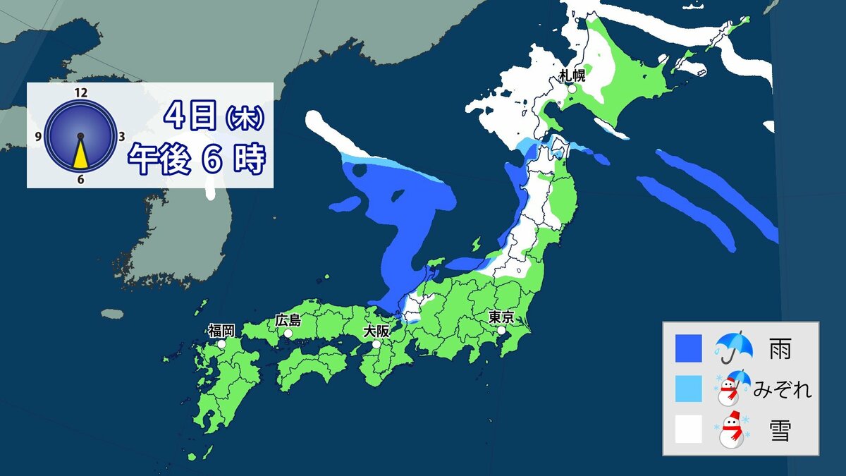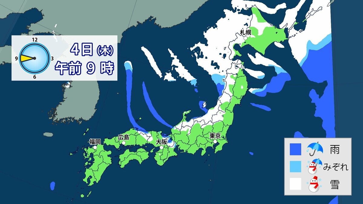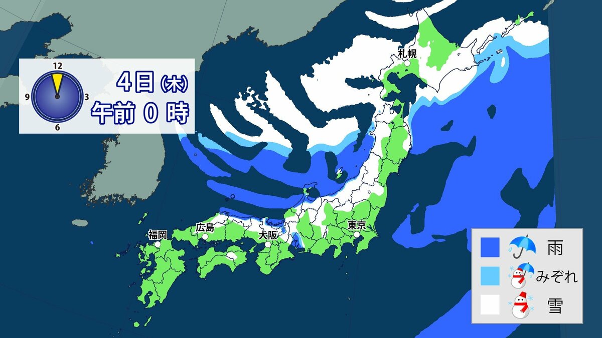 3日から4日にかけて冬型の気圧配置が強まり、日本列島の上空にはこの時期としては強い寒気が流れ込む予想です。日本海側を中心に西日本の広い範囲で雪になる可能性があります。