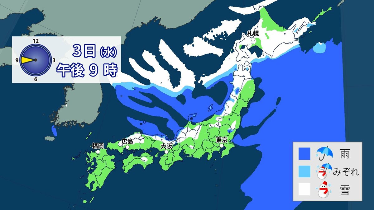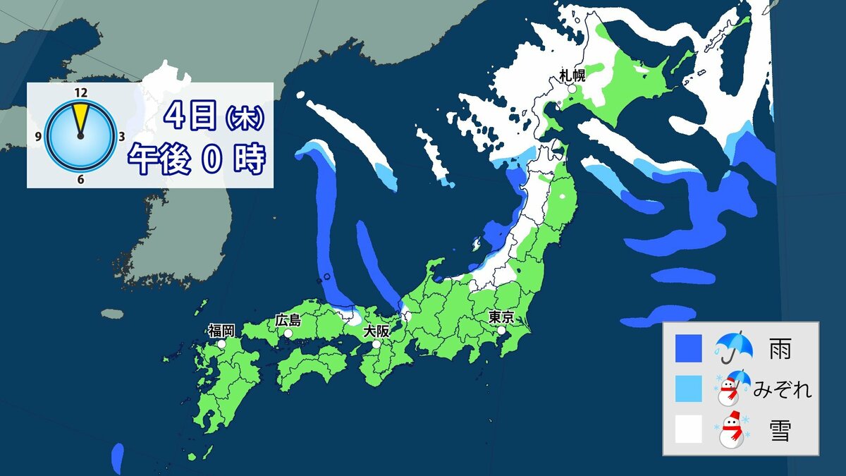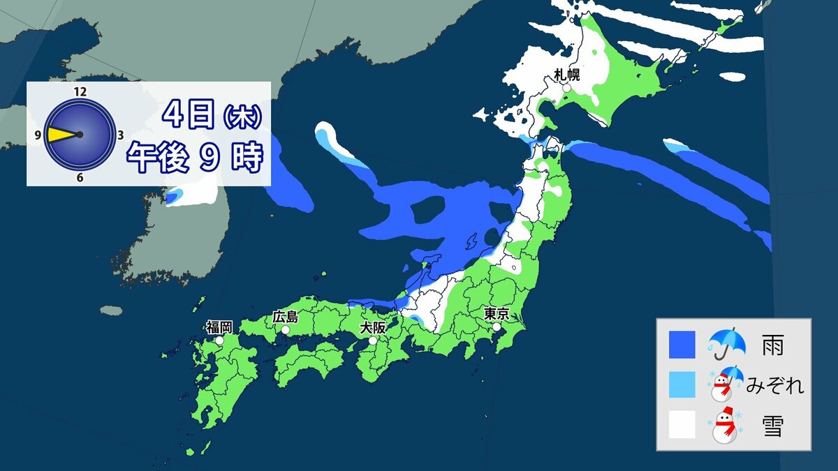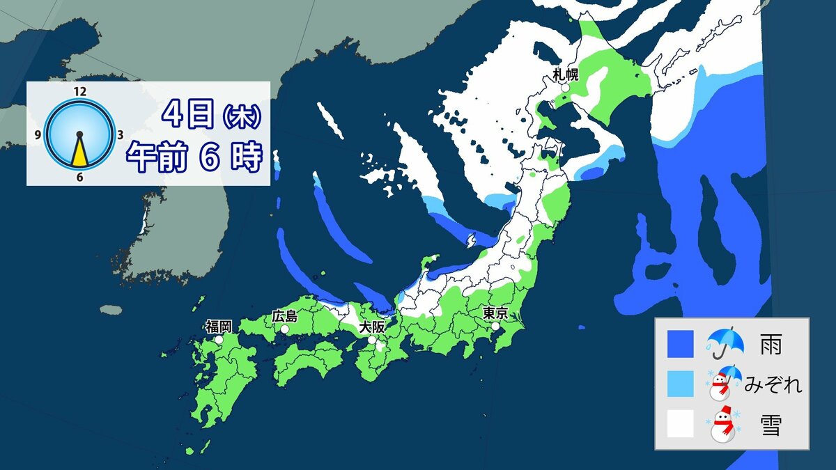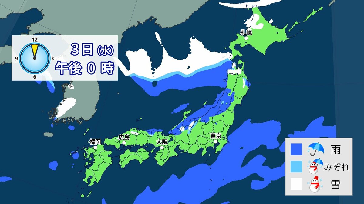 3日から4日にかけて冬型の気圧配置が強まり、日本列島の上空にはこの時期としては強い寒気が流れ込む予想です。日本海側を中心に西日本の広い範囲で雪になる可能性があります。