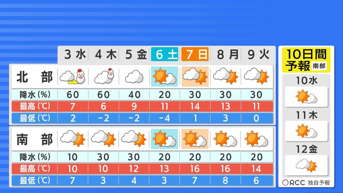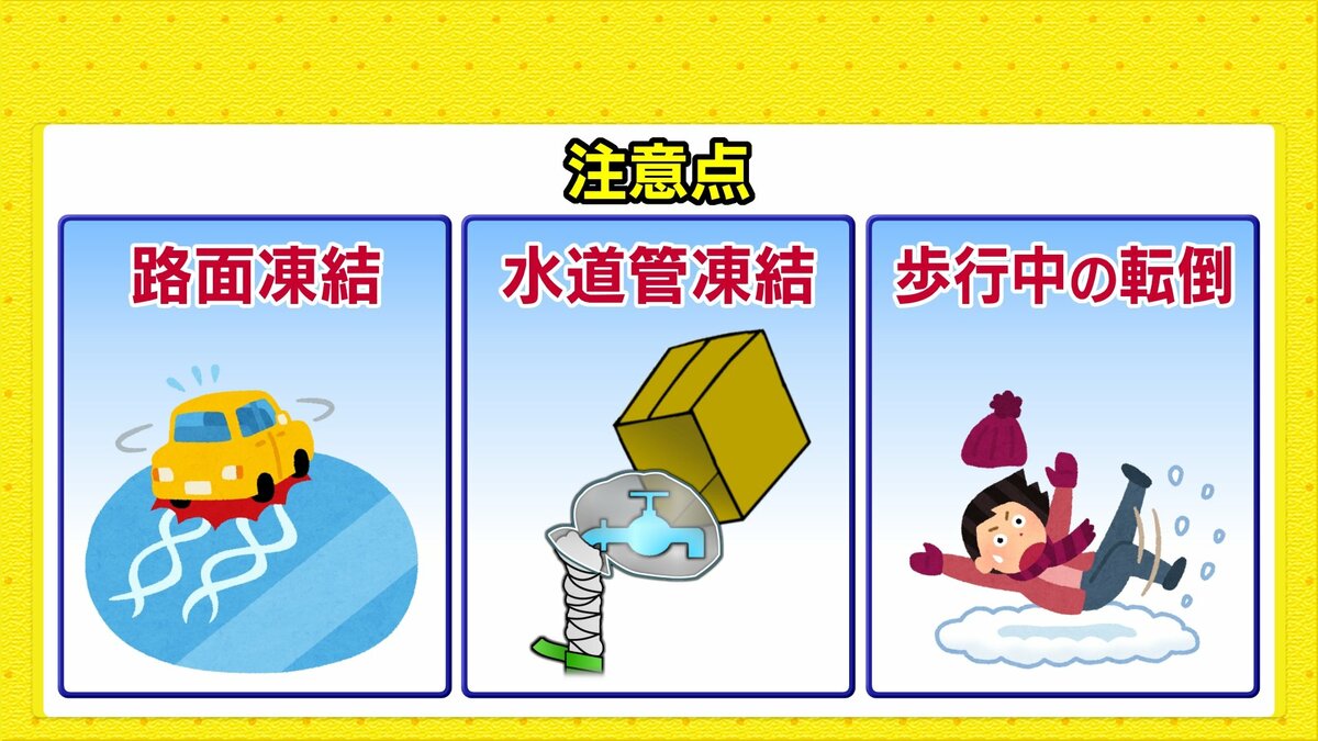 日中の気温は、木曜日にかけて真冬並の寒さになり、土曜日頃にかけて朝晩の冷え込みはかなり厳しいでしょう。路面の凍結や水道管の凍結に十分ご注意ください。