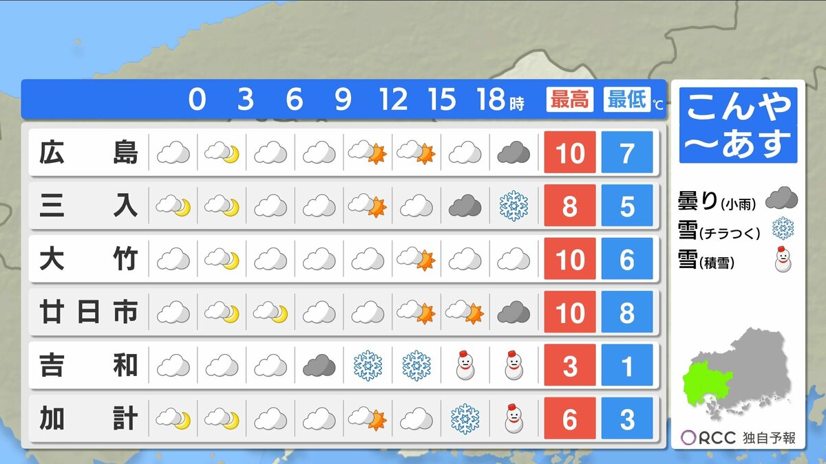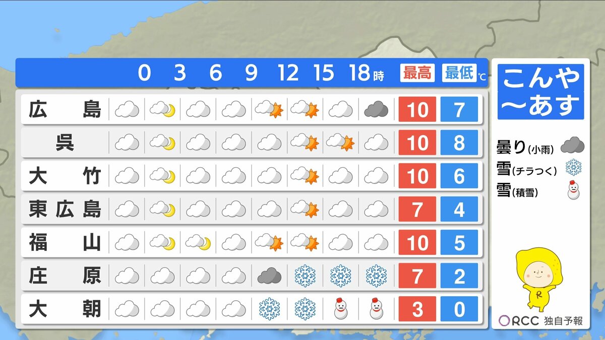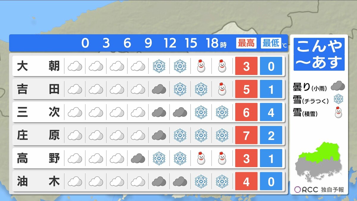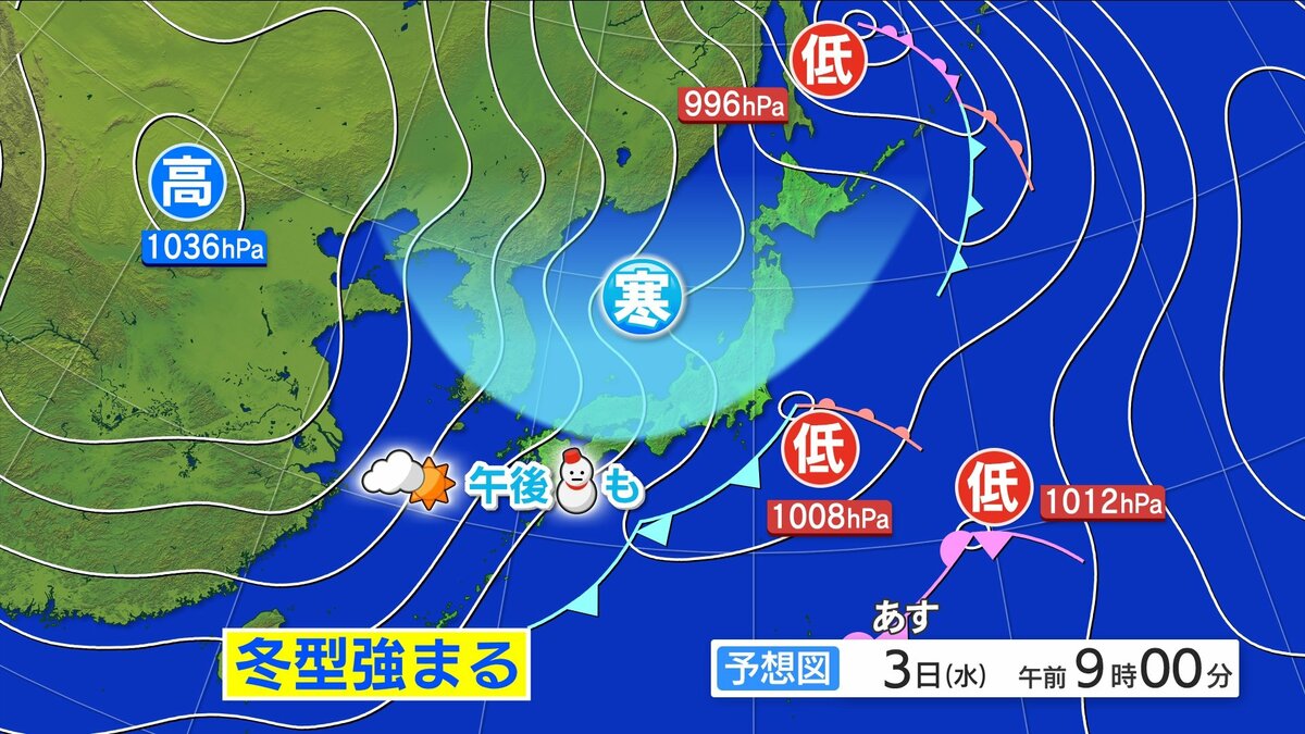 あすは冬型の気圧配置が強まり、あす後半からは真冬並の強い寒気が流れ込みます。寒気の影響で雲が広がりやすく、山地や標高高いところでは朝から雪が降る可能性があります。