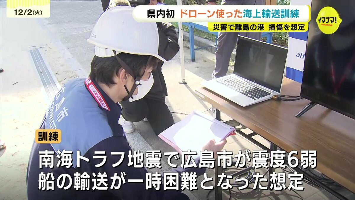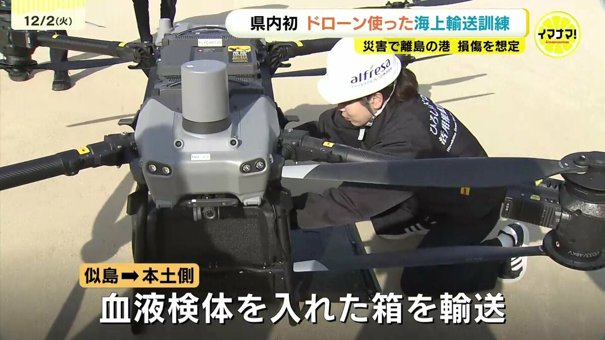 広島湾に浮かぶ似島は橋が架かっておらず、本土との交通手段はフェリーだけです。航路は似島に住む650人のライフラインとして機能しています。その航路が、南海トラフ地震で震度6弱の揺れに襲われ港湾が損傷し、一時的に断たれた想定でドローンを使って医薬品や血液を運ぶ訓練が2日行われました。