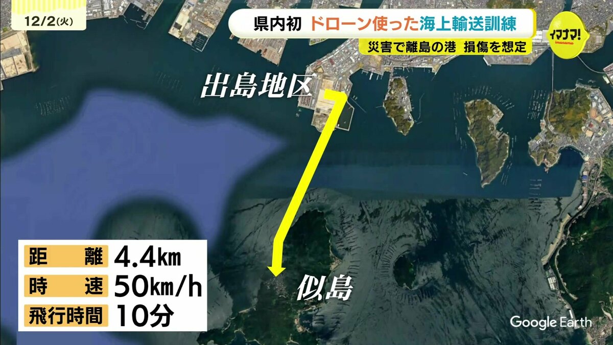 訓練ではまず、本土側から似島に向かって、注射や傷口の洗浄などに用いられる“生理食塩水”を模した、重さ約14kgの水を運びます。広島市南区の出島地区(本土側)から似島まで、4.4kmの距離を時速約50km、10分ほどで飛行します。操縦は県が委託した民間企業が、本土側でモニターをみながら遠隔で行います。