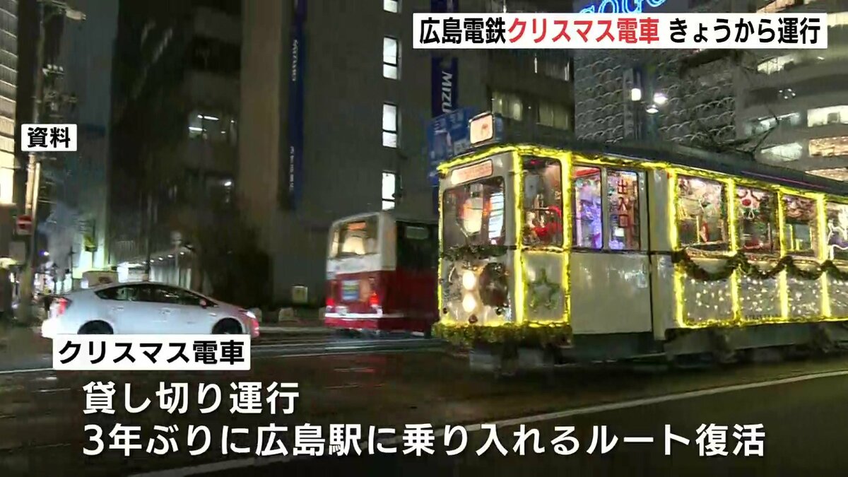 車内にはツリーが設置され、見る人も乗る人も楽しめるデザインとなっています。クリスマス電車は、貸し切りで広島市内を運行します。ことしは3年ぶりに広島駅に乗り入れるルートも復活しました。
