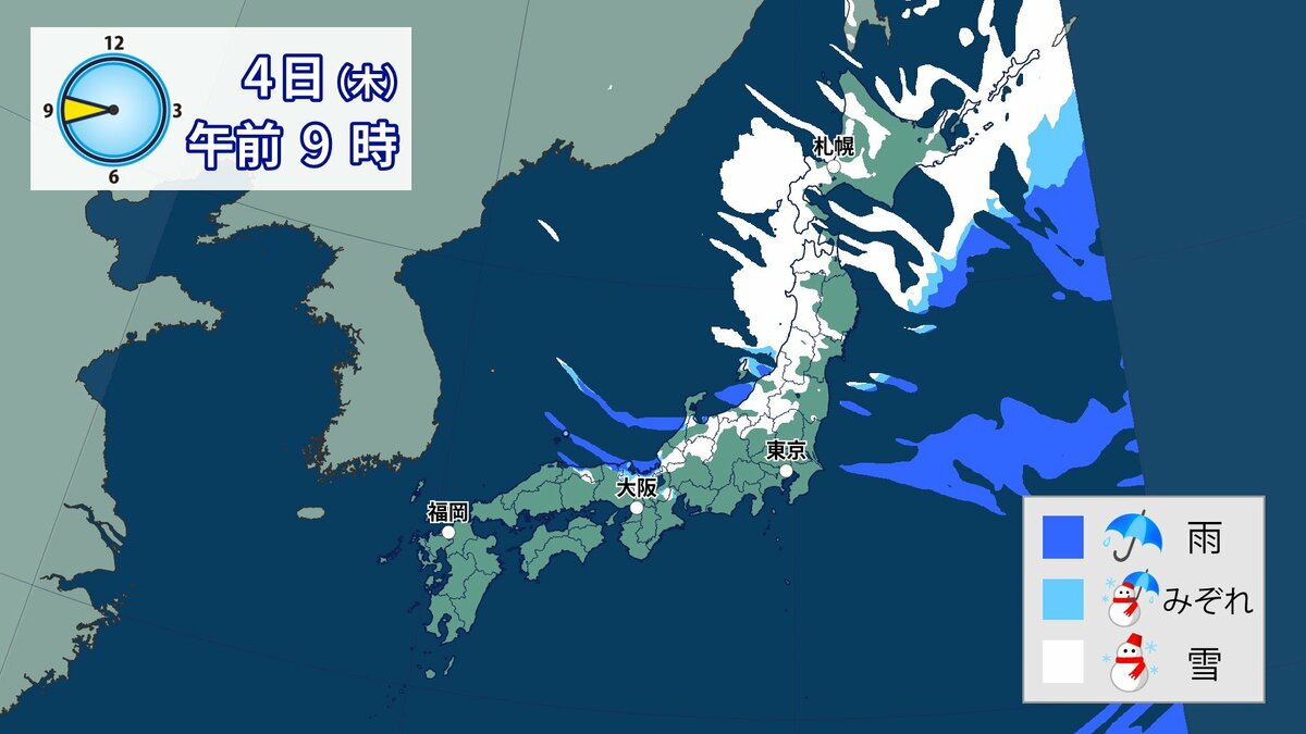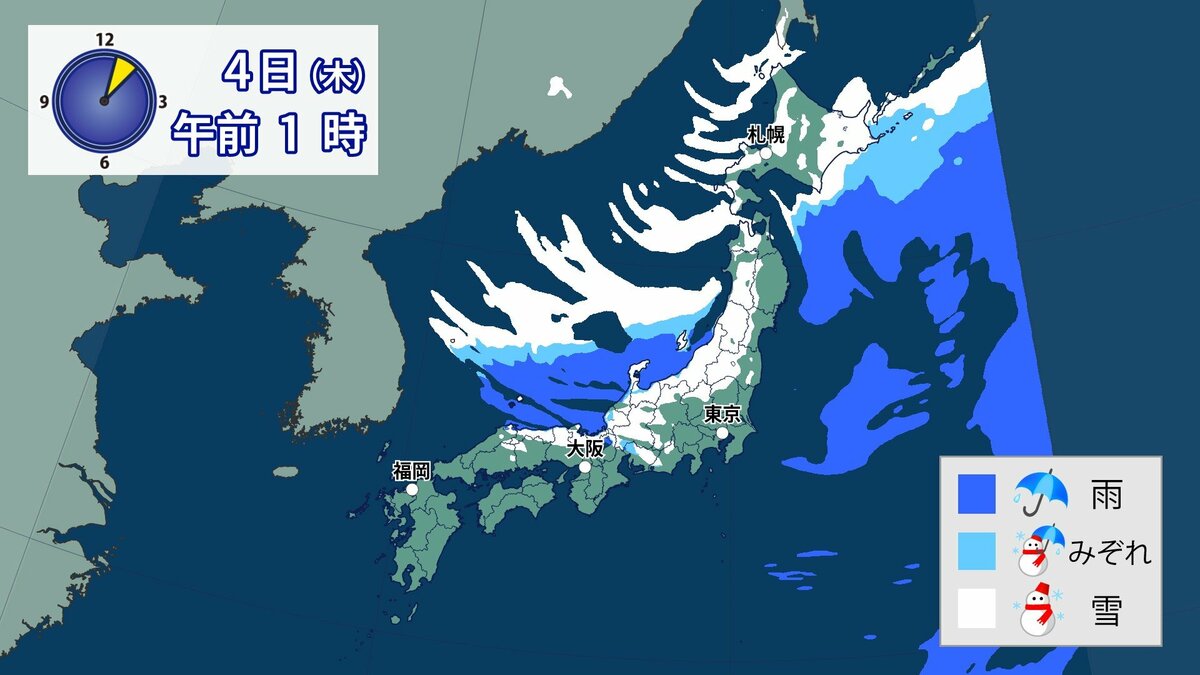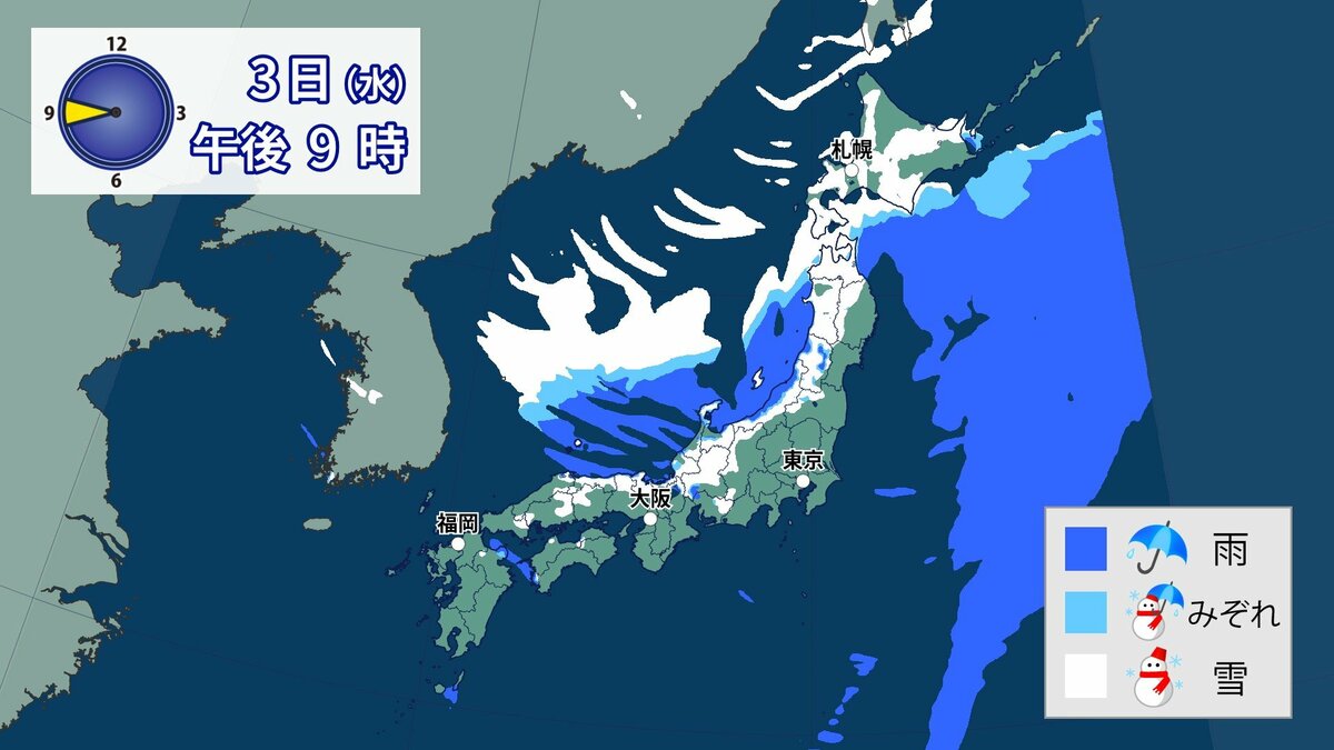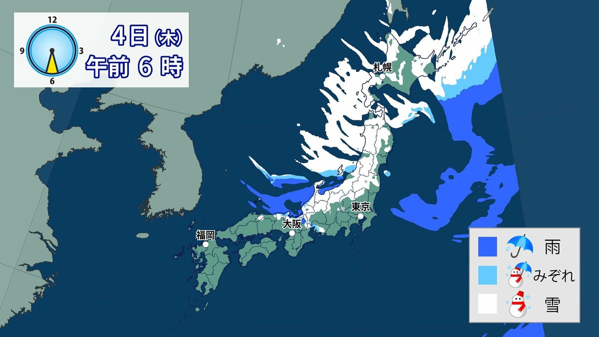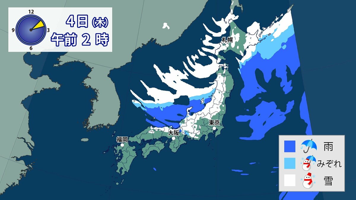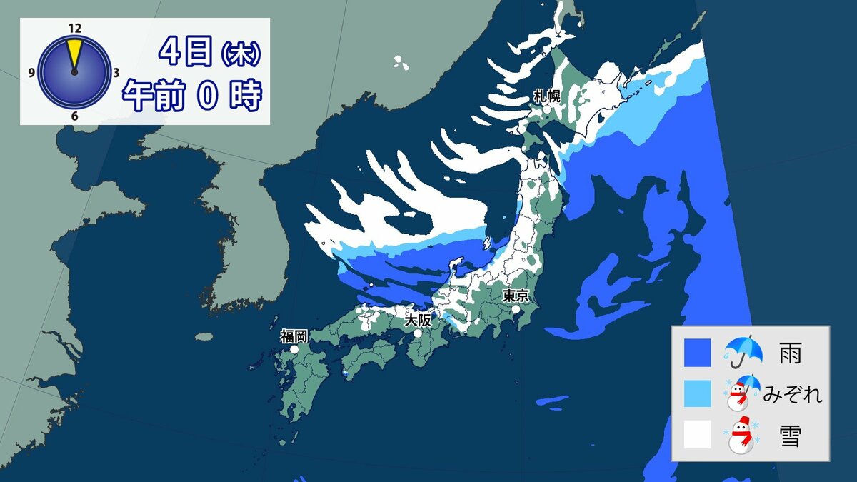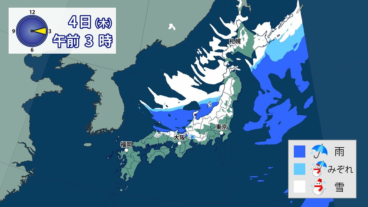 このあと、山地では4日の明け方にかけて雪が積もり、平地でも一部、雪雲が流れ込むところがあるでしょう。