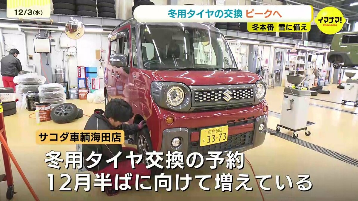 海田町にある自動車販売店では、先月半ばから冬用タイヤへの交換の問い合わせが増えているということです。