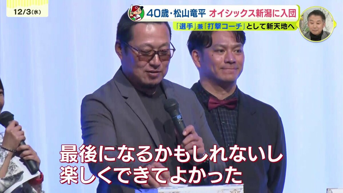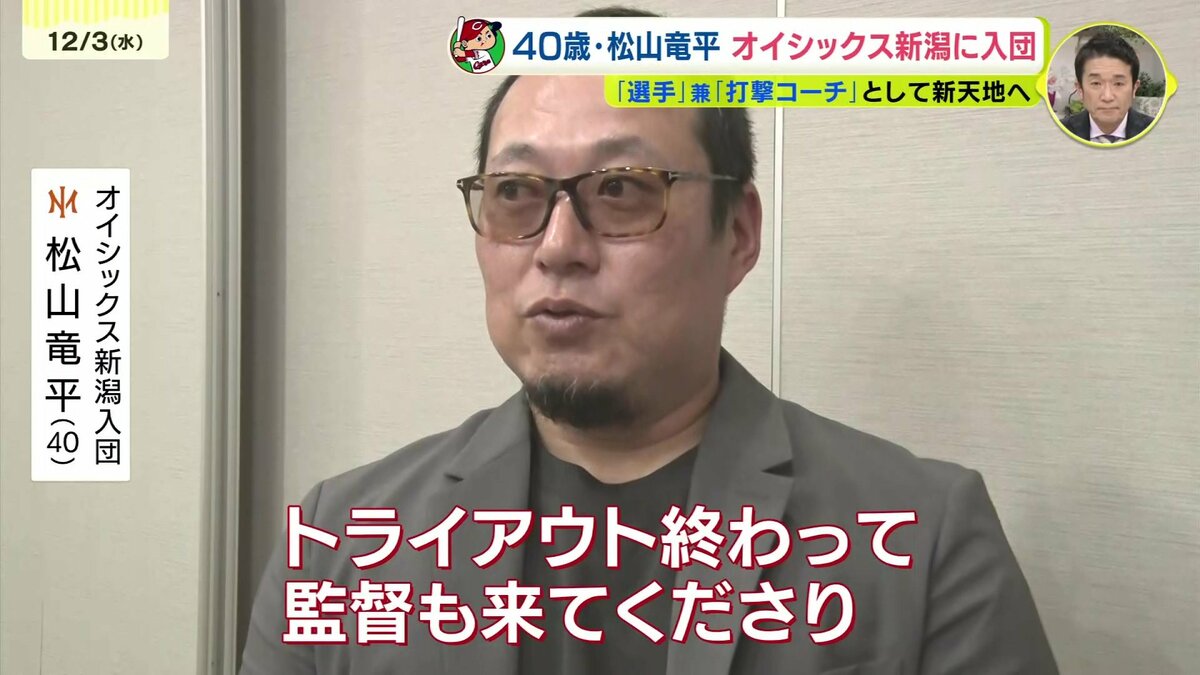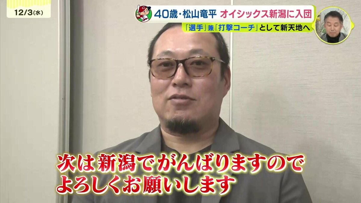 先月のトライアウトで3安打を放ち存在感を示していた松山竜平。選手と打撃コーチを兼任する形でのオファーを受け、オイシックス新潟アルビレックスBCへ入団することが決まりました。