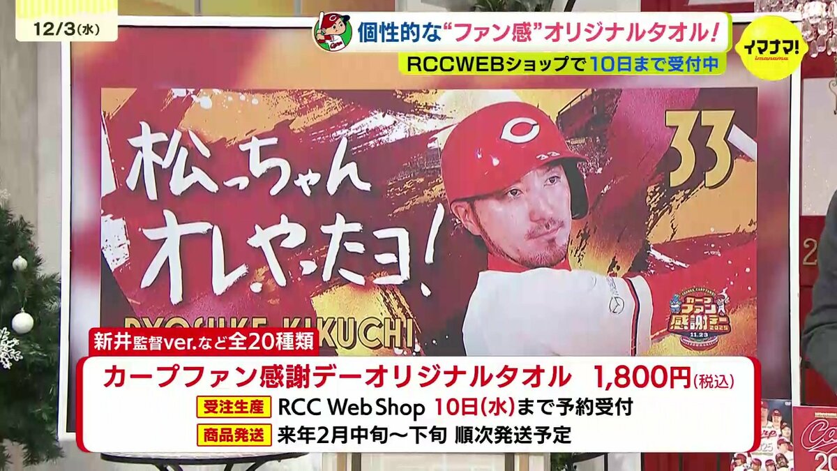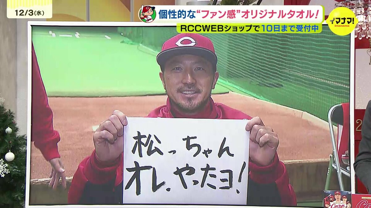 菊池涼介は、来季ヒーローインタビューで「松っちゃん、オレやったヨ!」と叫ぶと宣言。忘れないためにオリジナルタオルにもそのフレーズが刻まれます。