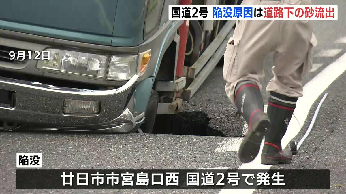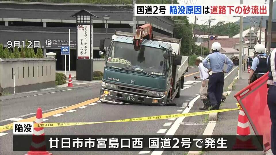 陥没は9月12日、廿日市市宮島口西の国道2号で起き、トラックの前輪がはまりました。大きさは長さがおよそ4メートル、幅5メートル、深さ2・4メートルでした。