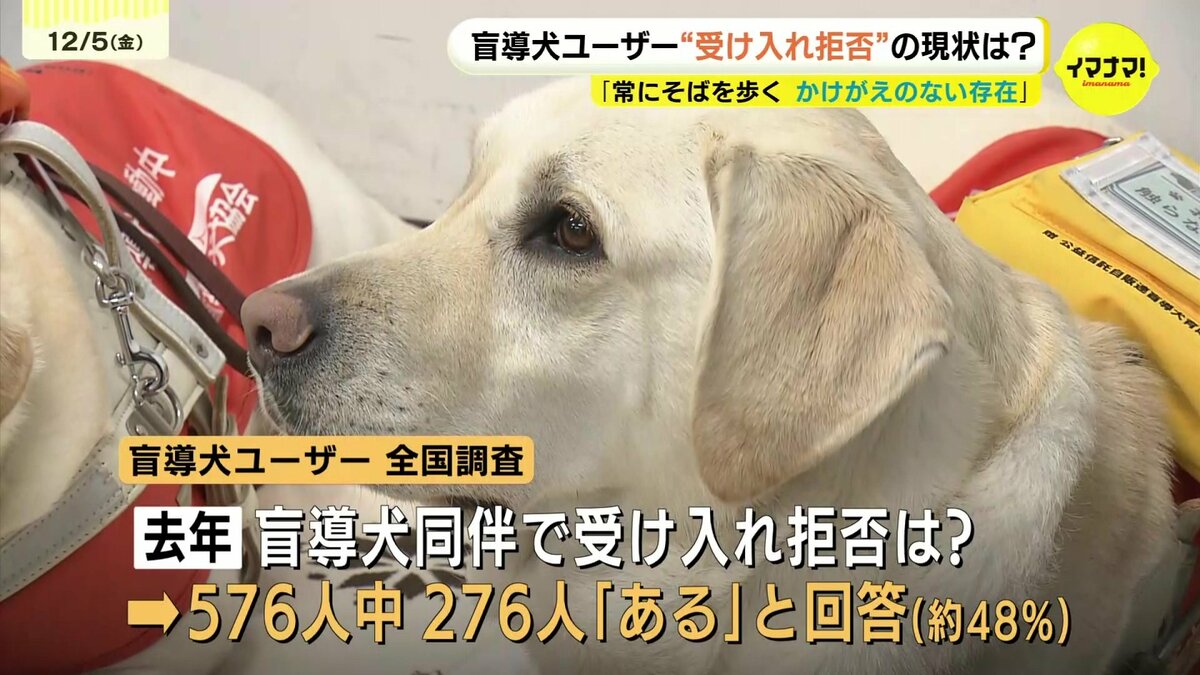 盲導犬ユーザーへの全国調査によると2024年、飲食店や交通機関などで、受け入れを拒否された人は約半数にのぼっています。2020年の調査とほぼ横ばいで、受け入れが進んでいない現状が浮き彫りとなっています。