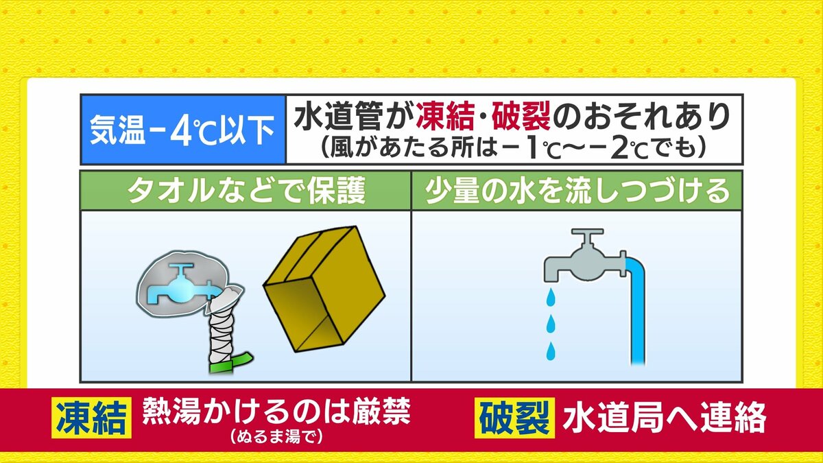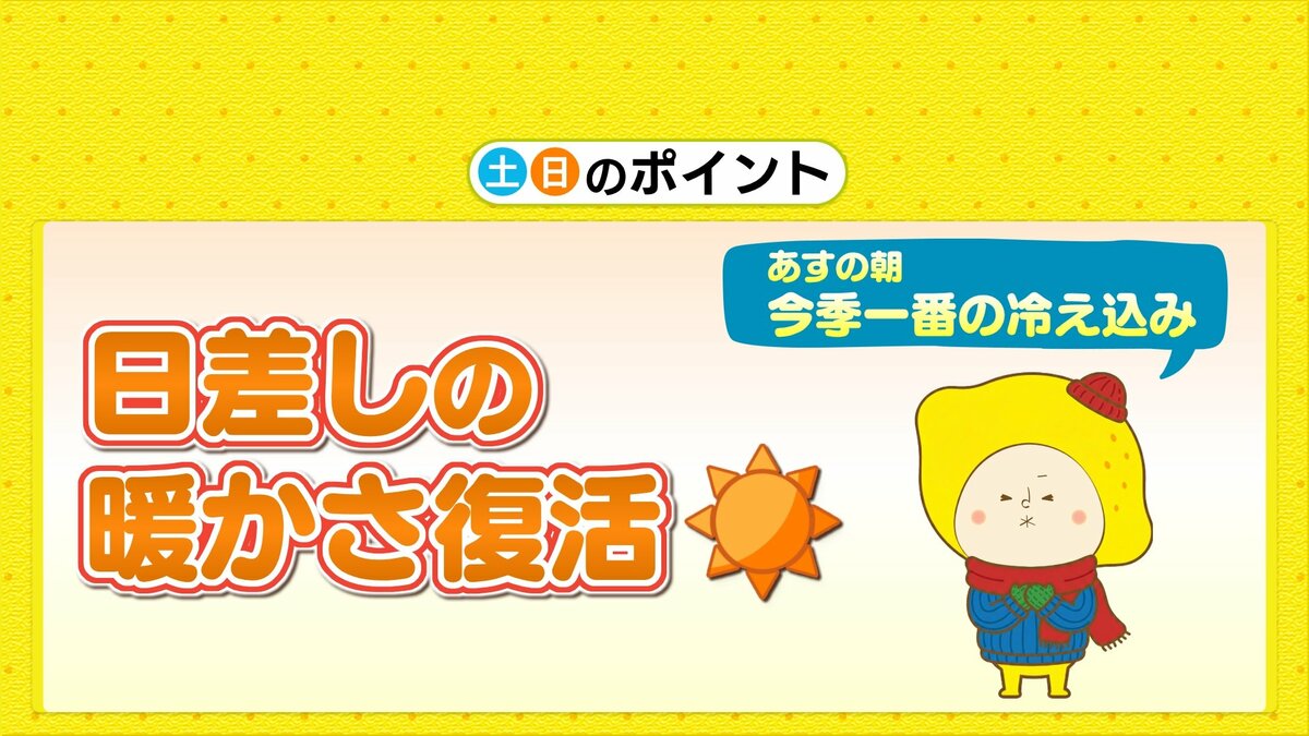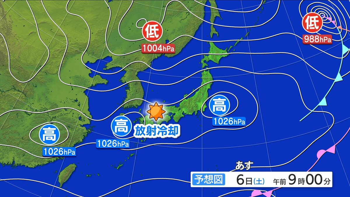 6日(土)は、高気圧に覆われて、雲が少なくよく晴れる予想です。その分、朝は放射冷却が強まり、各地で今シーズン1番の冷え込みとなるでしょう。北部・内陸では各地氷点下の冷え込みに。水道管や路面の凍結にご注意ください。朝、霧が出るところもありますので、車の運転などはご注意ください。