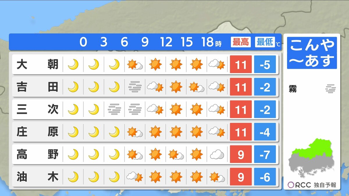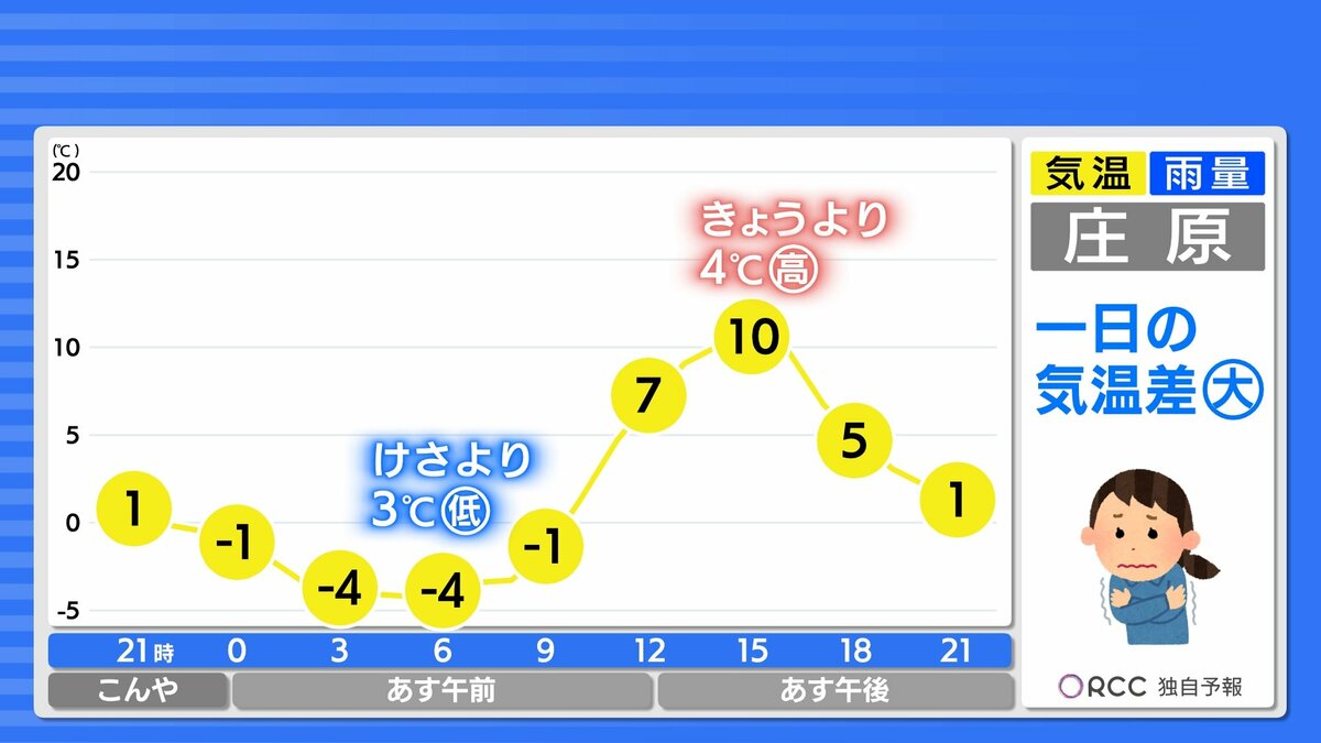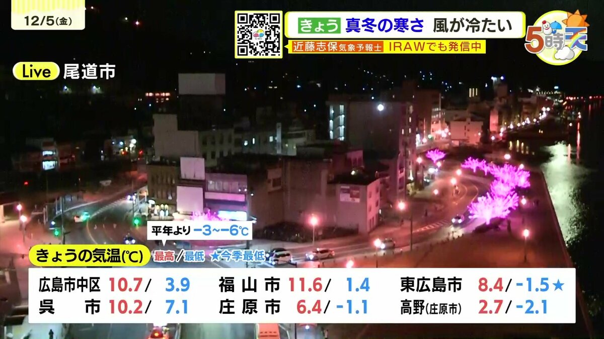 きょう5日(金)の広島県内は、日差しがあっても風が冷たい1日になりました。最高気温は広島市中区で10.7℃、庄原市で6.4℃、平年よりも3~6℃低くなっています。